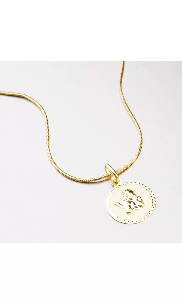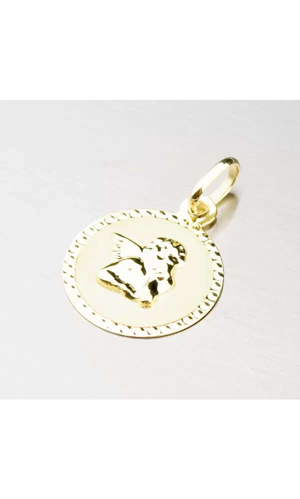 Prívesok je vyrobený zo žltého štrnásťkarátového zlata 585/1000. Zlatý prívesok sa môže pýšiť na prednej strane roztomilým anjelikom, ktorý zdobí gravírovanie po okrajoch a matná povrchová úprava. Zlatým príveskom potešíte muža aj ženu.