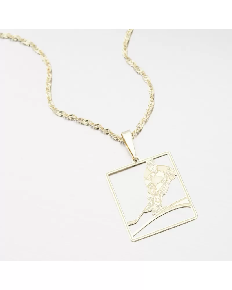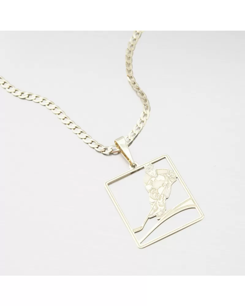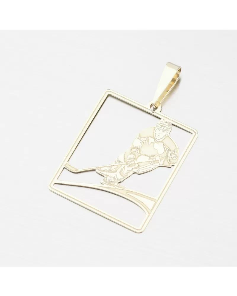 Dokonalý darček pre športovcov alebo športových fanúšikov v hokeji. Zlatý prívesok v tvare obdĺžnikovej doštičky, ktorá nie je vyplnená, ale iba obrys doštičky a na nej je potom hokejista. Ten je vykreslený pomocou jemných liniek a striedanie lesku a zamatového matu. Druhá strana je v lesku a bez liniek.