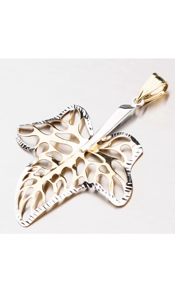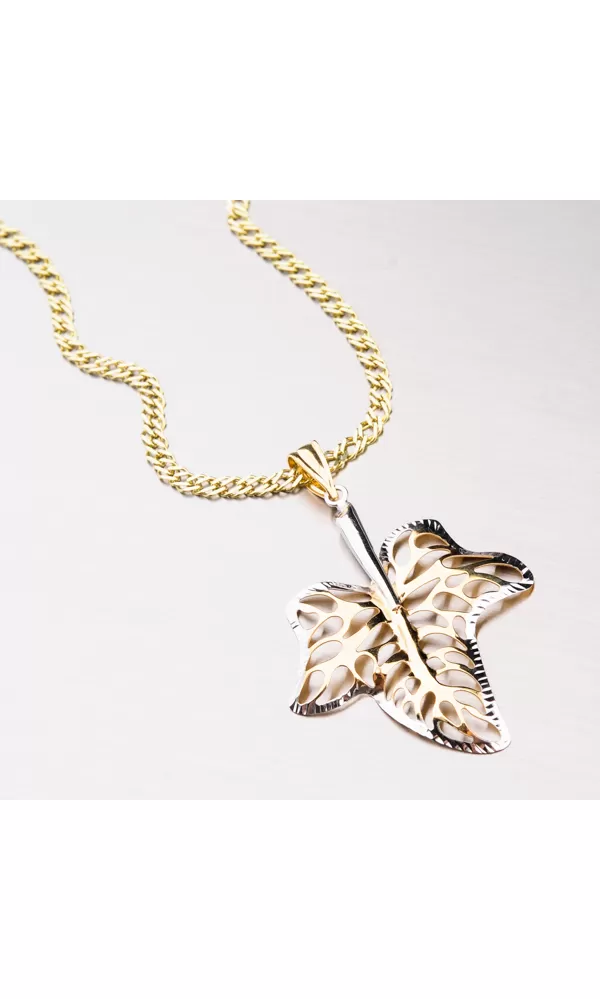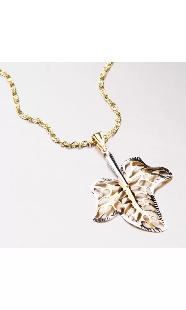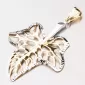 Veľký ale ľahučký prívesok v tvare javorového listu vás bude dokonale zdobiť vás dekolt. Zlatý prívesok je vyrobený zo žltého štrnásťkarátového zlata 585/1000 v lesklej povrchovej úprave. Prívesok je zdobený po okrajoch a na stonke bielu farbu zlata, ktorá je miestami zvýraznená gravírovaním.