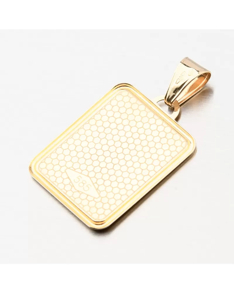 Prívesok je vyrobený zo žltého štrnásťkarátového zlata 585/1000 v lesklej a matnej povrchovej úprave. Tento šperk bol skontrolovaný puncovým úradom, ktorý overil jeho kvalitu a označil štátnym puncom pre danú rýdzosť.