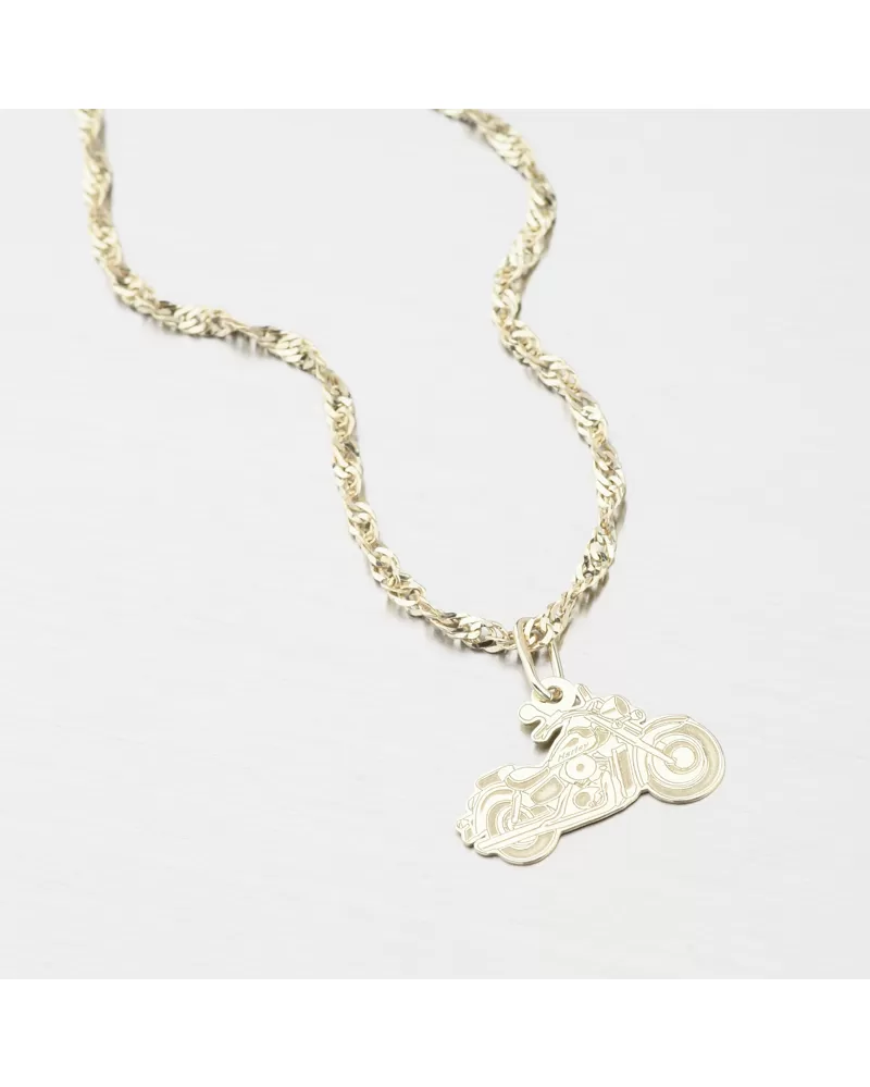 Drobný zlatý prívesok v tvare motorky, ktorá je symbolom voľnosti a ľahkosti, ktorú cítite na dvoch kolesách. Prívesok je z jednej strany do detailu prepracovaný pre dokonalé zvýraznenie motorky pomocou jemných rýh a kombináciu lesklej a matnej úpravy a druhá strana prívesku je vo vysokom lesku.
