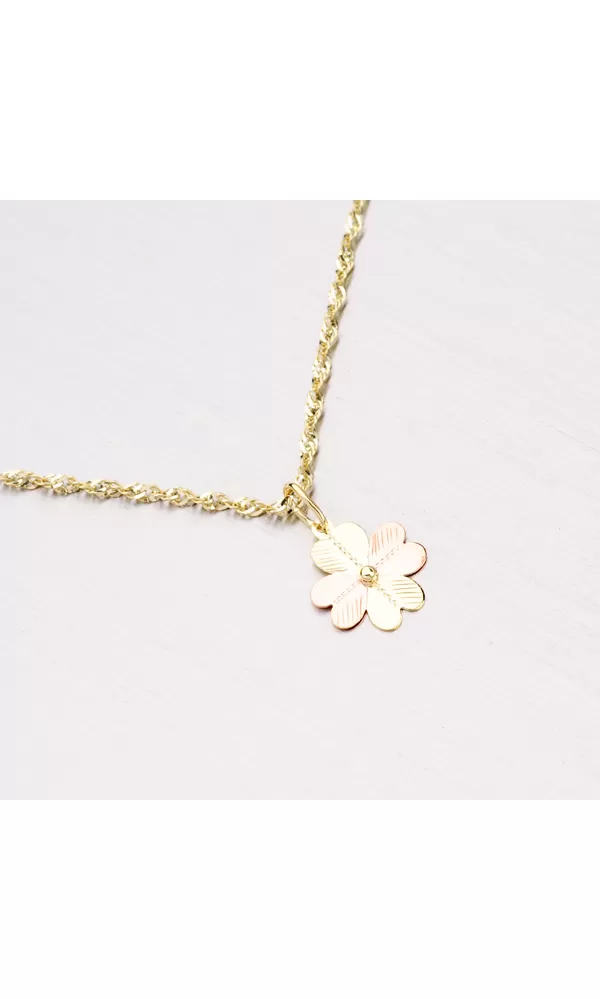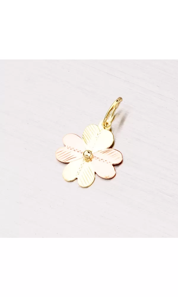 Jemný zlatý prívesok v tvare štvorlístka pre šťastie je vyrobený v kombinácii žltého a červeného štrnásťkarátového zlata 585/1000 v lesklej povrchovej úprave. Prívesok zdobí precízne ručné rytie. Tento prepracovaný kúsok musíte mať. Bude sa vo Vašom dekolte krásne vynímať.
