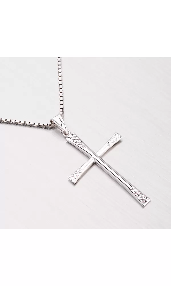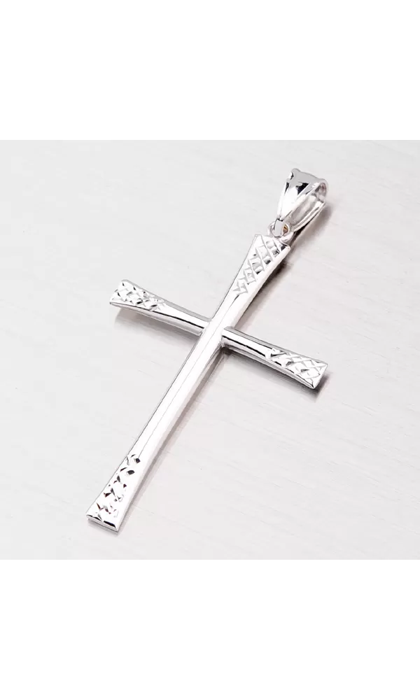 Tento prívesok v tvare kríža je vyrobený z bieleho štrnásťkarátového zlata 585/1000 v lesklej povrchovej úprave. K tomuto prívesku je možné použiť retiazku o max. priemere 3 mm.