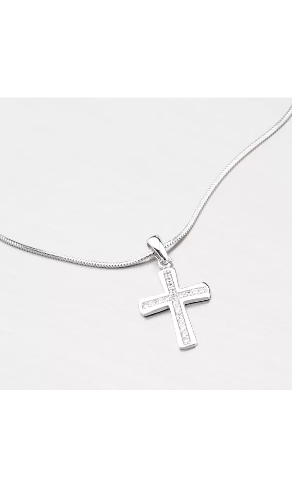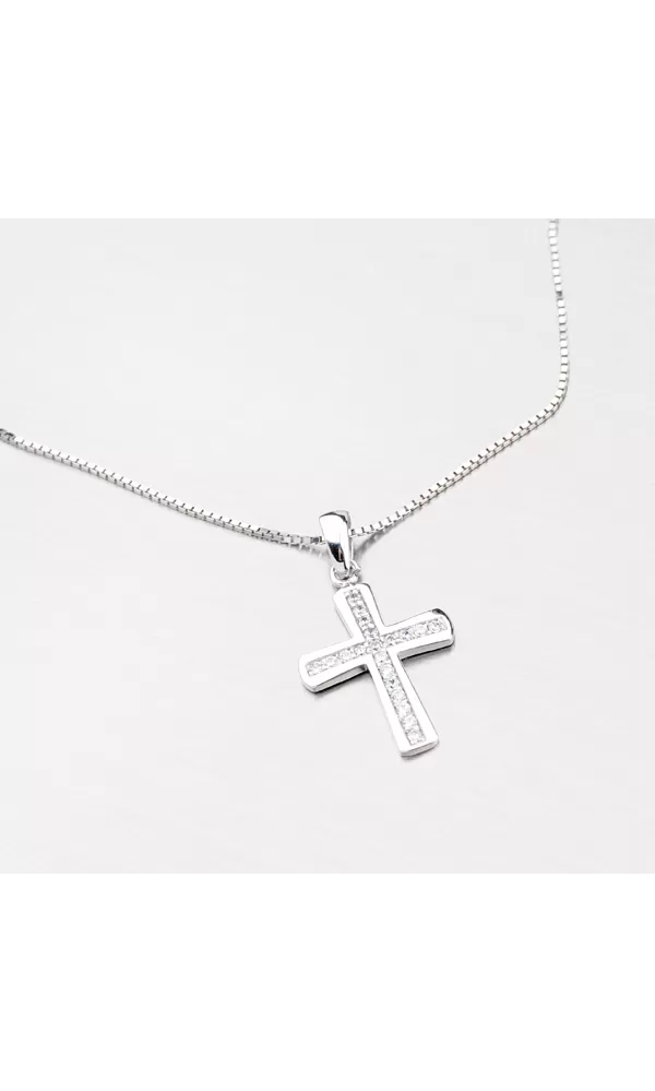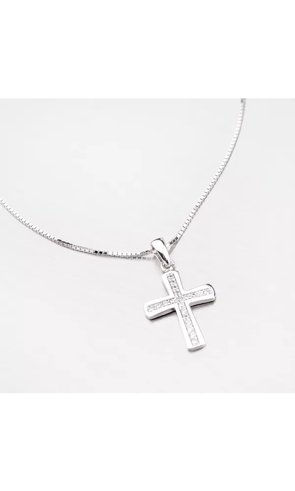 Tento prívesok z bieleho štrnástich karátového zlata o rýdzosti 585/1000 v tvare krížika vás zaujme svojim jednoduchým, ale napriek tomu nádherným vzhľadom. Krížik je uprostred vysadený radom zirkónov, ktoré sa tiahnu cez všetky ramená kríža, okolo ktorých je lesklý povrch prívesku.