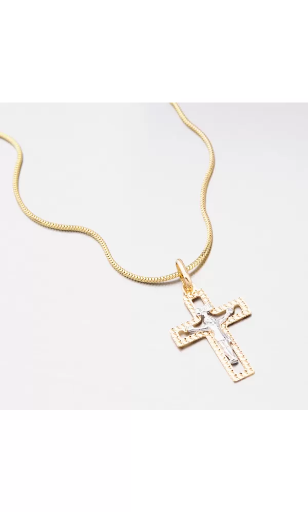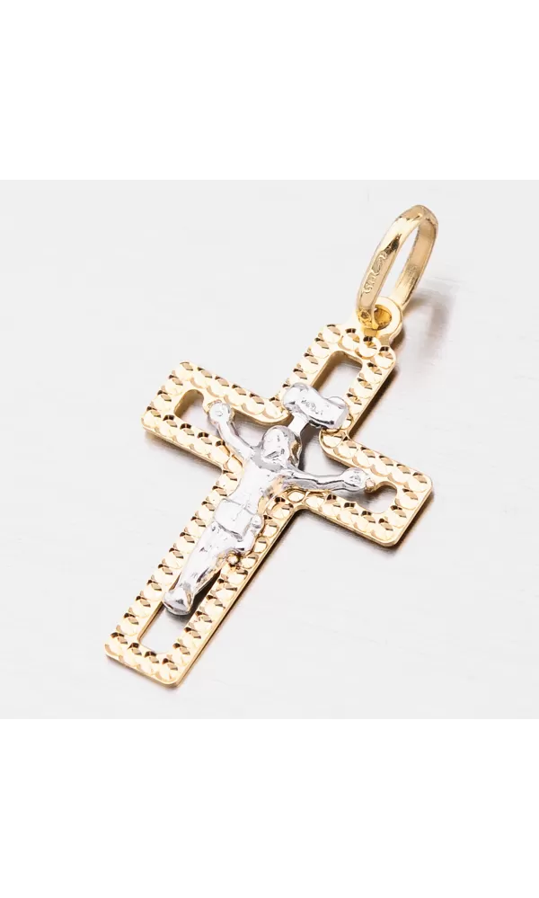 Prívesok v tvare kríža je zdobený Ježišom, ktorý je vyrobený z bieleho zlata. vykonanie Ježiša Krista je veľmi precízna práca, ktorú môžete posúdiť voľným okom. Kríž je v žltej farbe zlata a zvýraznený je gravírovaním pomocou diamantového hrotu, vďaka ktorému získa šperk maximálny lesk a brilanciu zo všetkých uhlov. Tento prívesok je vhodný na každodenné nosenie. Stane sa vašim obľúbeným šperkom. Prívesok je vyrobený zo žltého štrnásťkarátového zlata 585/1000 v lesklej povrchovej úprave.