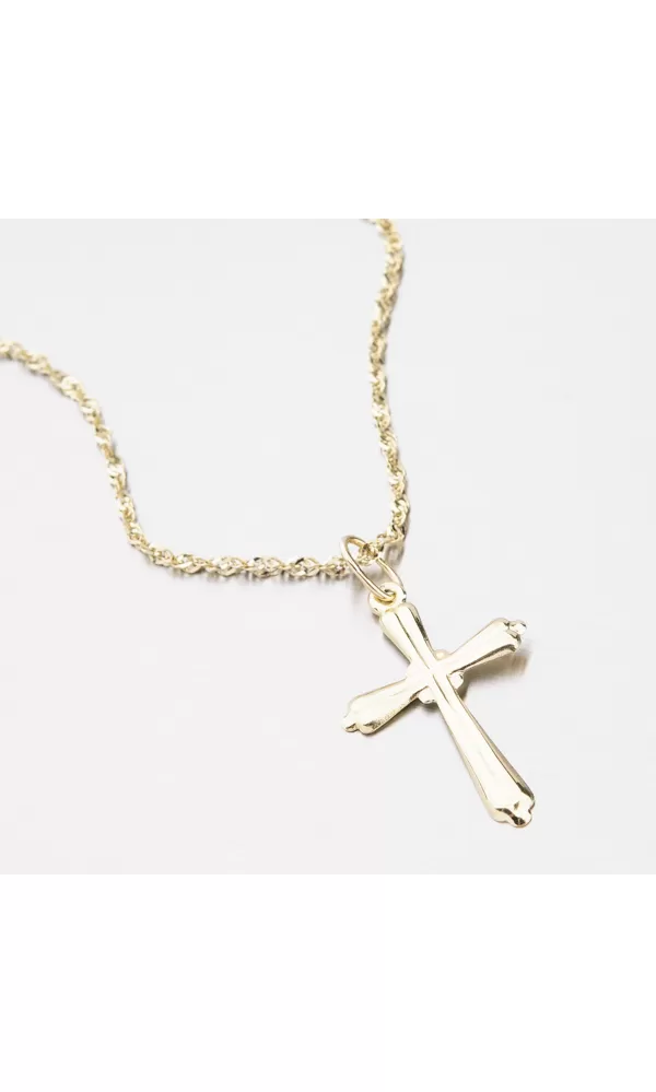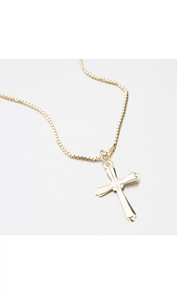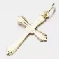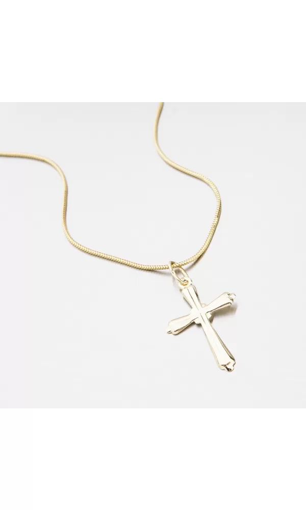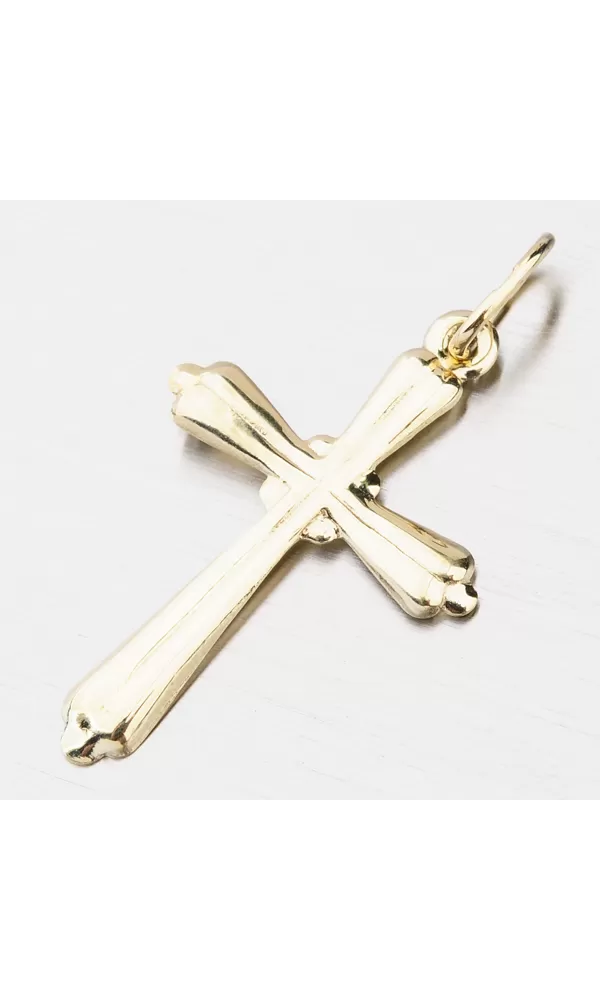 Kríž je vhodný pre mužov a ženy a vďaka plochej chrbte príjemne dodržiava dekolt. Kríž je vyrobený zo žltej štrnásť -karátovej zlata - 585/1000 na lesklom povrchu