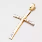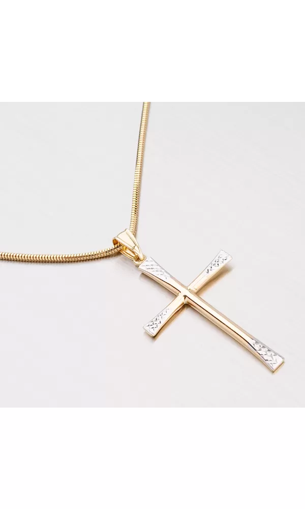 Tento väčší prívesok v tvare krížika je vyrobený zo štrnásťkarátového zlata 585/1000 v kombinácii žltej a bielej farby zlata v lesklej povrchovej úprave. Biele zlato je upravené gravírovaním - facetami, ktoré sú zhotovené diamantovým nástrojom, ktorý dodáva vzniknutým facetám maximálny lesk, vďaka ktorému dokonale odráža svetlo a majú krásnu brilanciu zo všetkých uhlov pohľadu!
