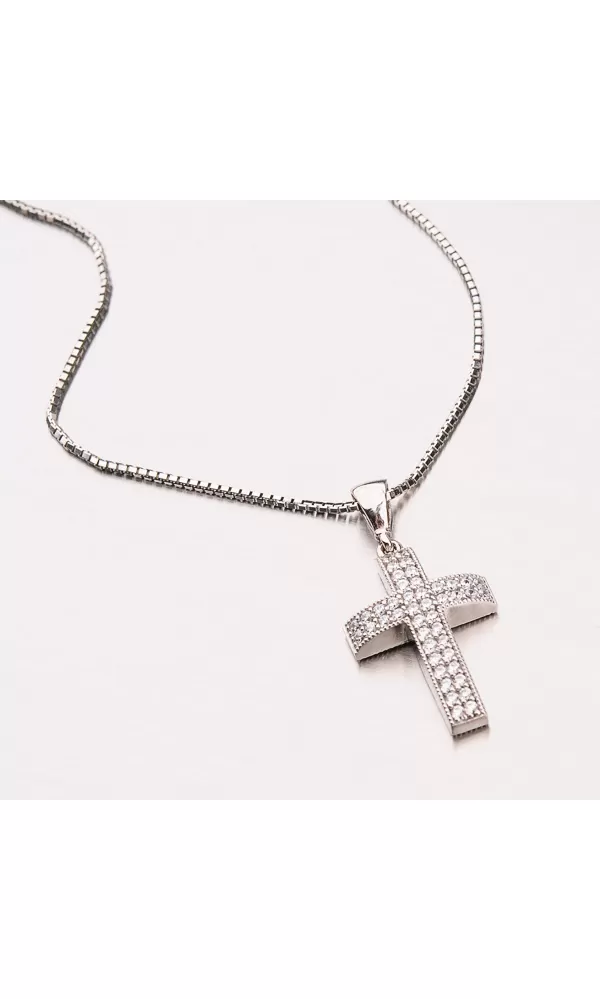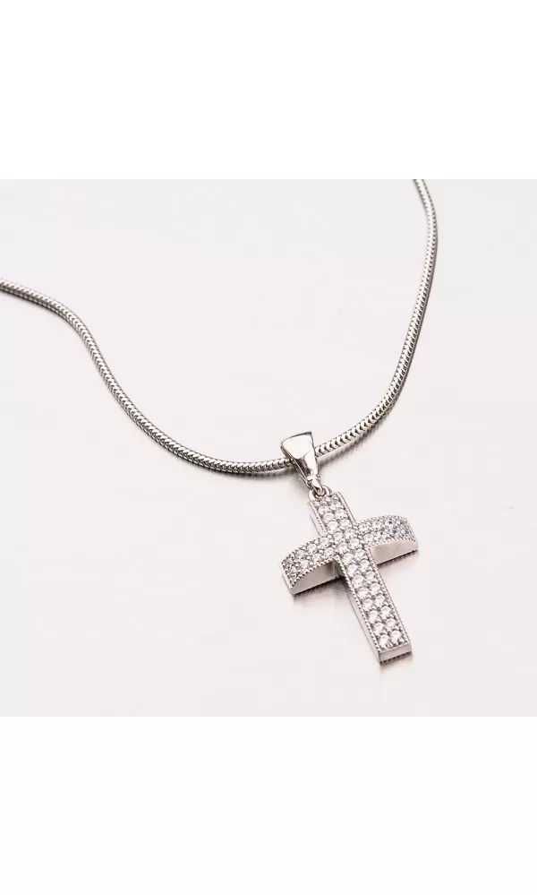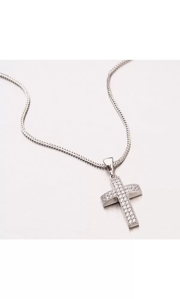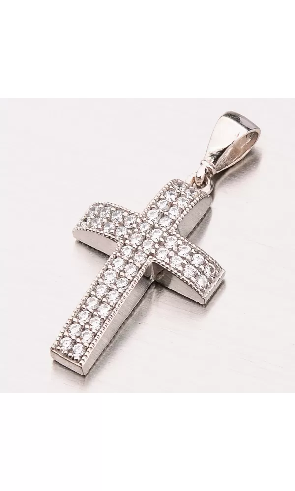 Neuveriteľne žiarivý prívesok v tvare kríža zaujme na prvý pohľad. Dizajn prívesku je jednoduchý ale zdobia ho zirkónmi v briliantovom bruse.  Prívesok je vyrobený z bieleho štrnásťkarátového zlata 585/1000 v lesklej povrchovej úprave.