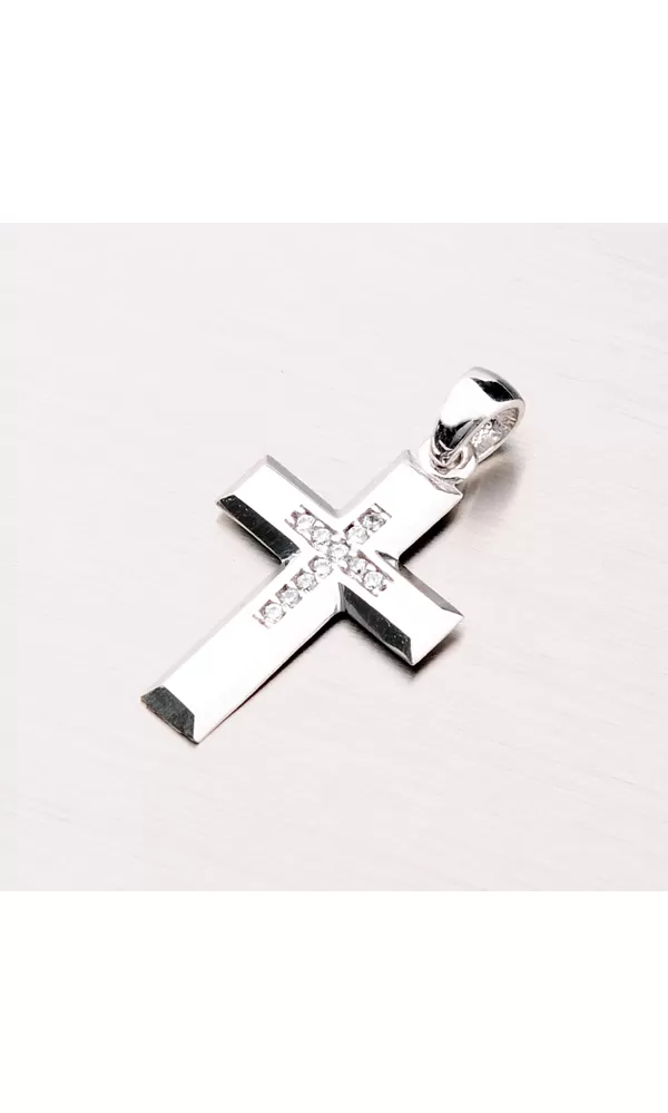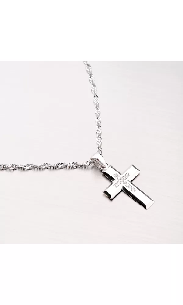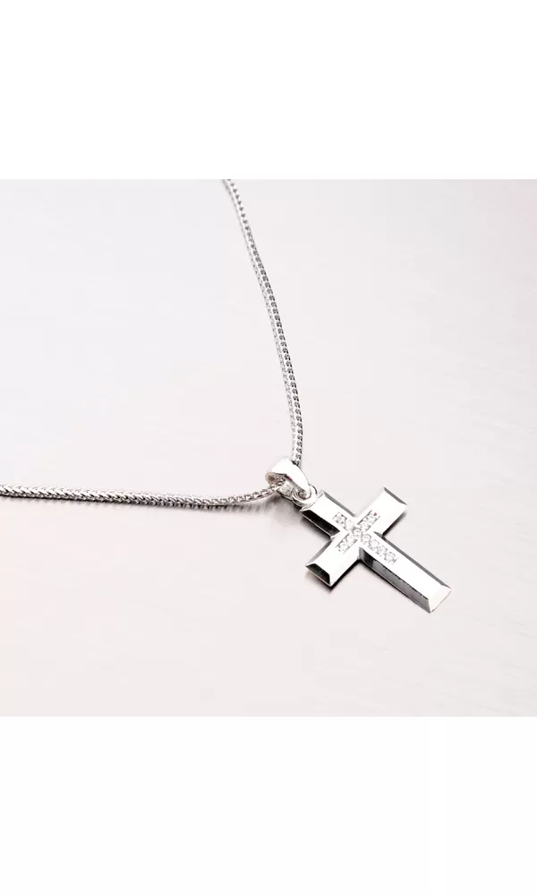 Jemný prívesok v tvare kríža poteší ženy aj mužov. Zlatý prívesok je zdobený zirkónmi v briliantovom bruse. Tento brús prepožičiava zirkónom brilanciu pravých diamantov. Zadná strana prívesku je príjemne hladká a tak prívesok dokonale priľne k dekoltu. Krížiky sú obľúbeným šperkom a nemal by nikomu chýbať v šperkovnici. Prívesok je vyrobený z bieleho štrnásťkarátového zlata 585/1000 v lesklej povrchovej úprave.