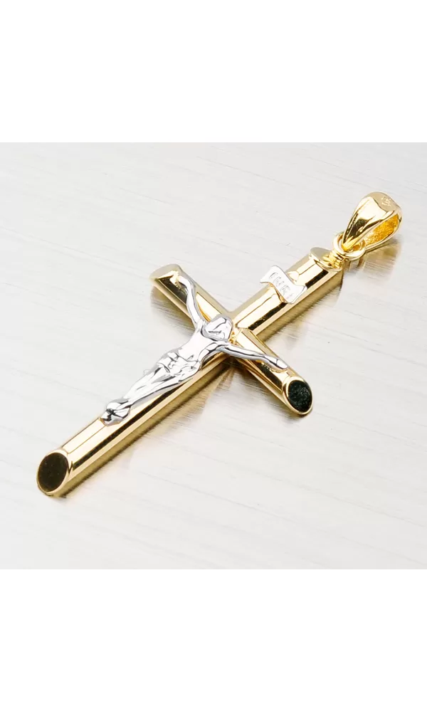 Prívesok s okrúhlym v tvare Krista je vyrobený zo štrnástich karátových zlata s čistotou 585/1000 v kombinácii bielej a žltej farby s lesklým povrchom. Nad Kristom je pergamen s uvedenými písmenami Inri. Prívesok je podrobne a môžete s ním upútať pozornosť.