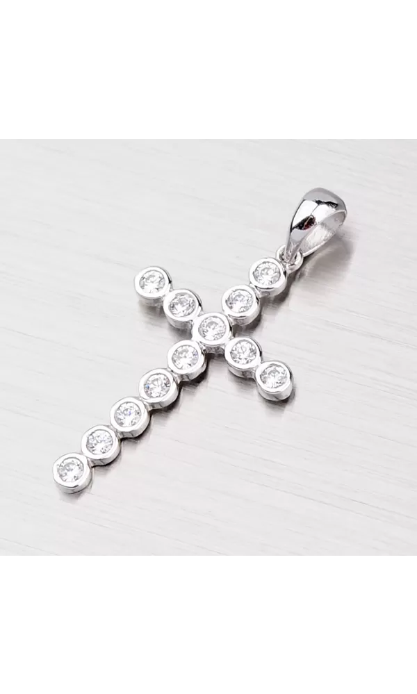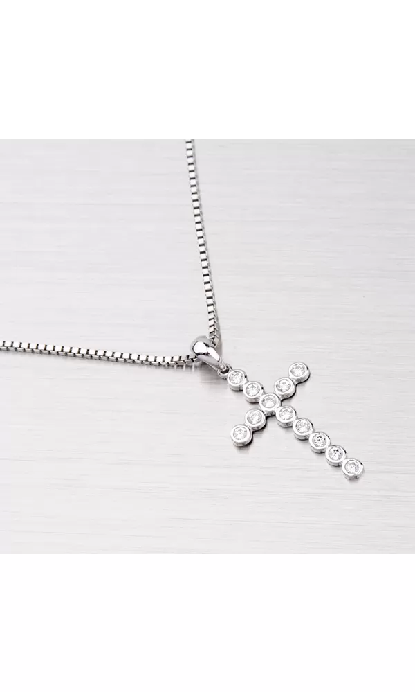 Prívesok v tvare kríža je vyrobený z bieleho štrnásťkarátového zlata 585/1000 v lesklej povrchovej úprave. Zlatý kríž je posádzaný po celom svojom obvode drobnými bielymi zirkónmi. K tomuto prívesku je vhodné použiť retiazku s max. priemerom 2,50 mm