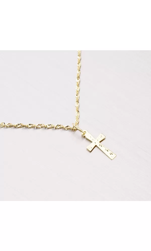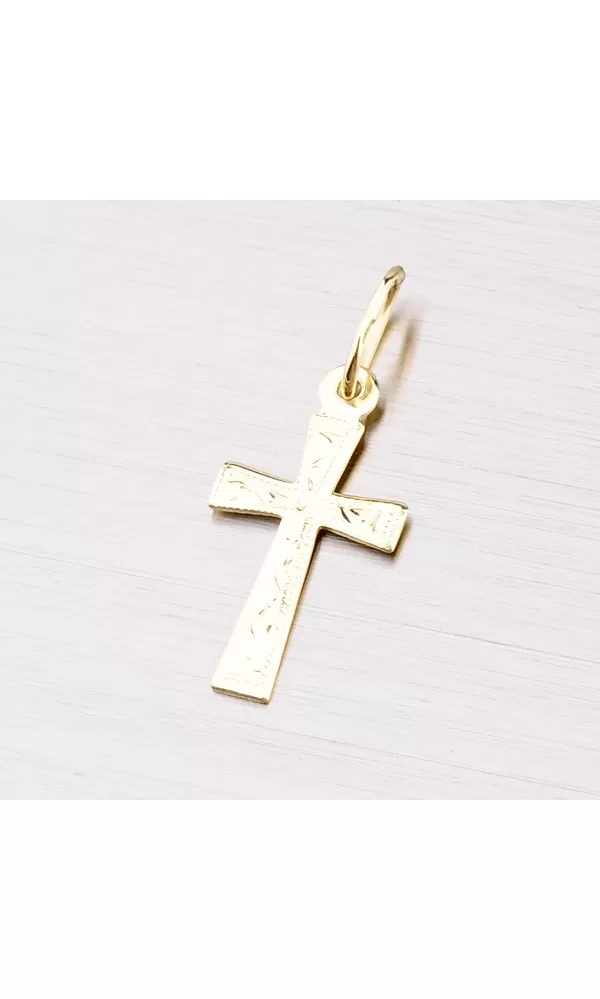 Prívesok v tvare kríža zdobený ručným gravírovaním je vyrobený zo žltého štrnásťkarátového zlata 585/1000 v lesklej povrchovej úprave. Pri tomto prívesku je na prvý pohľad zrejmé dokonalé spracovanie do najmenších detailov.