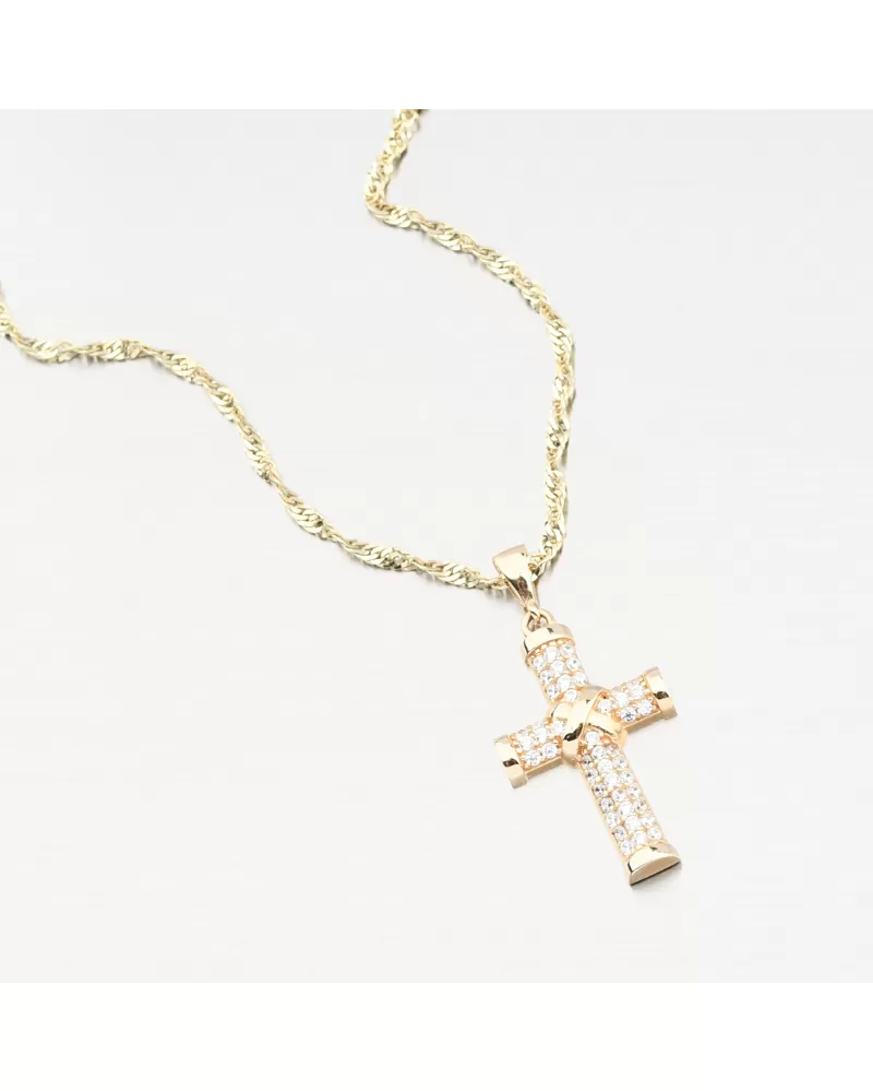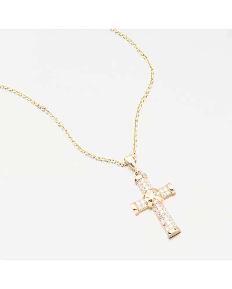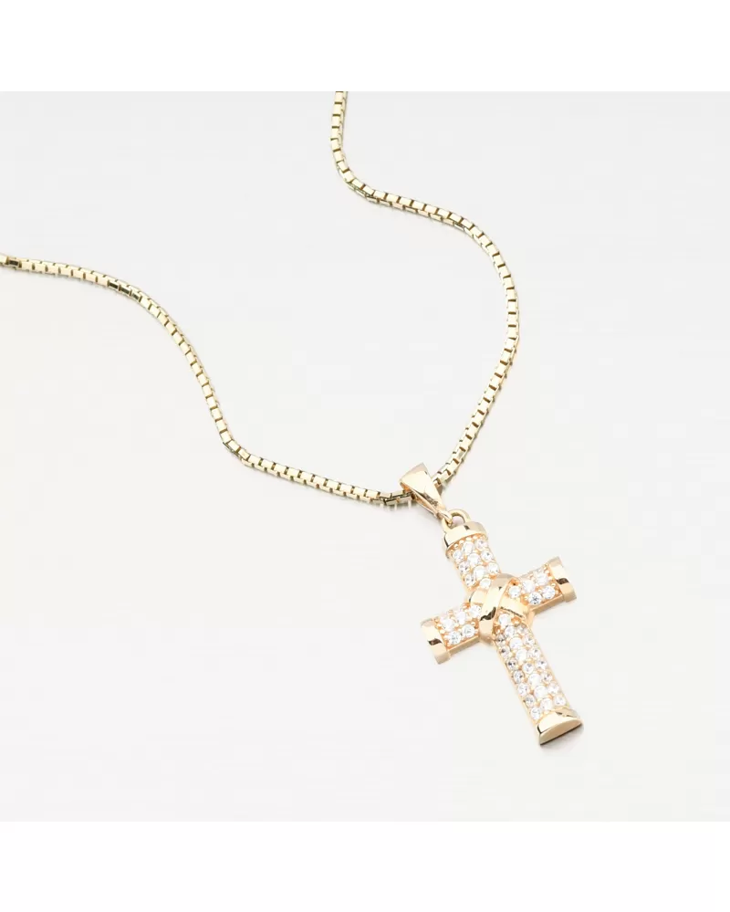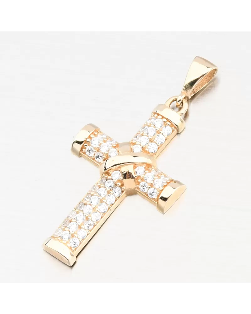 Elegantný zlatý prívesok v tvare kríža osadený trblietavými zirkónmi žiari noblesou a vierou. Nadčasový symbol ochrany a štýlu, ktorý upúta na prvý pohľad. Prívesok pôsobí decentne, no nezameniteľne - ideálny darček pre mužov a ženy, ktorí oceňujú krásu s hlbším významom. Zirkóny sú briliantovo vybrúsené, čo zaisťuje maximálnu brilanciu brúsených faziet, dokonale odráža svetlo a neuveriteľne sa leskne z každého pohľadu.