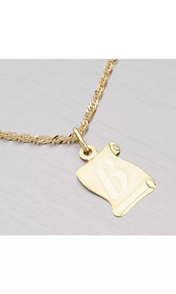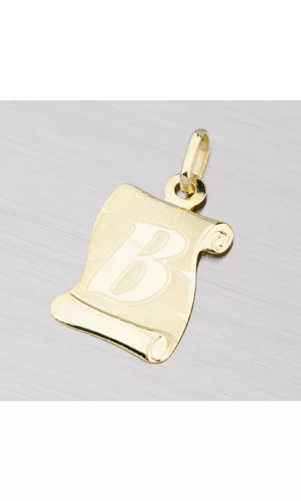 Väčší matný pergamen s ozdobným lesklým písmenkom B je vyrobený zo žltého štrnásťkarátového zlata 585/1000. Prívesok je vyrobený v kombinovanej povrchovej úprave lesk/mat.