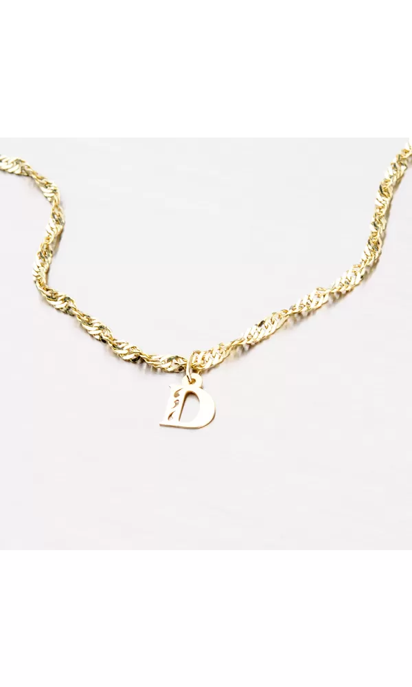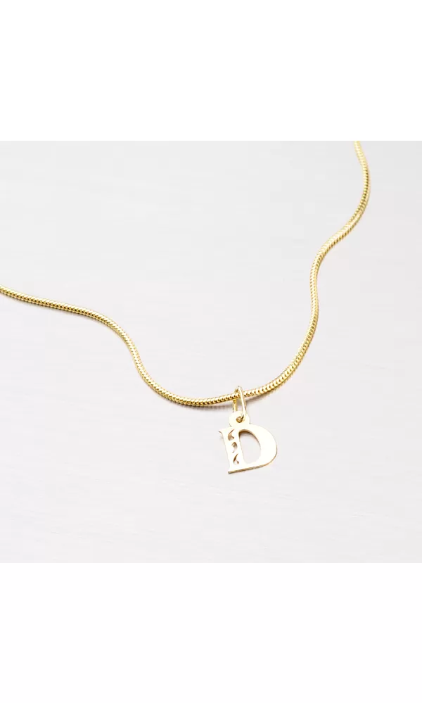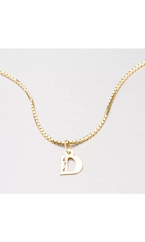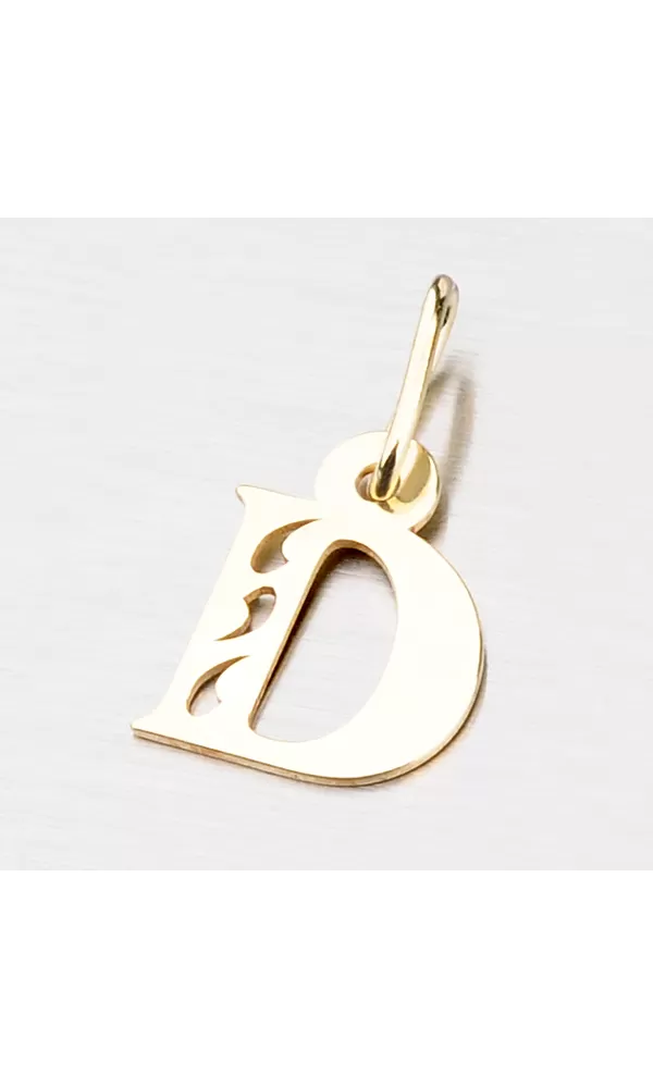 Prívesok v tvare písmenka D je vyrobený zo žltého štrnásťkarátového zlata 585/1000. Prívesok je vyrobený v lesklej povrchovej úprave s jemnými prosekmi v tvare kvapky. Na doplňujúcich fotografiách je prívesok vidieť na retiazke: 364-0100,  44-1028  a  44-1137 alebo ďalej môžete vyberať v celej kategórii  zlatých retiazok.