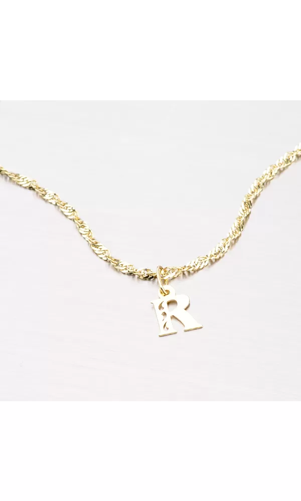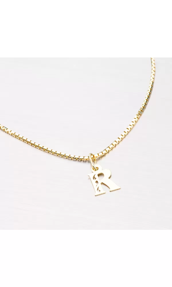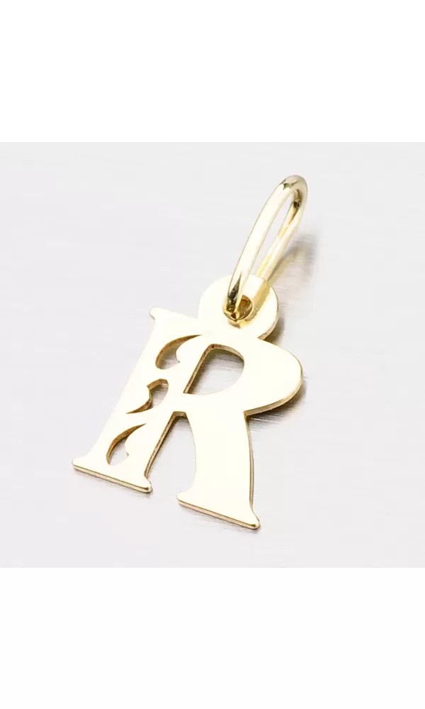 Prívesok v tvare písmenka R je vyrobený zo žltého štrnásťkarátového zlata 585/1000. Prívesok je vyrobený v lesklej povrchovej úprave s jemnými prosekmi v tvare kvapky. Na doplňujúcich fotografiách je prívesok vidieť na retiazke: 364-0100,  44-1028  a  44-1137 alebo ďalej môžete vyberať v celej kategórii  zlatých retiazok.