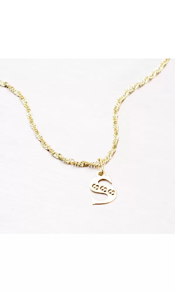 Prívesok v tvare písmenka S je vyrobený zo žltého štrnásťkarátového zlata 585/1000. Prívesok je vyrobený v lesklej povrchovej úprave s jemnými prosekmi. Na doplňujúcich fotografiách je prívesok vidieť na retiazke: 364-0100,  44-1028  a  44-1137 alebo ďalej môžete vyberať v celej kategórii  zlatých retiazok.