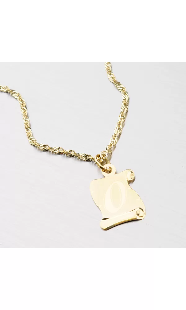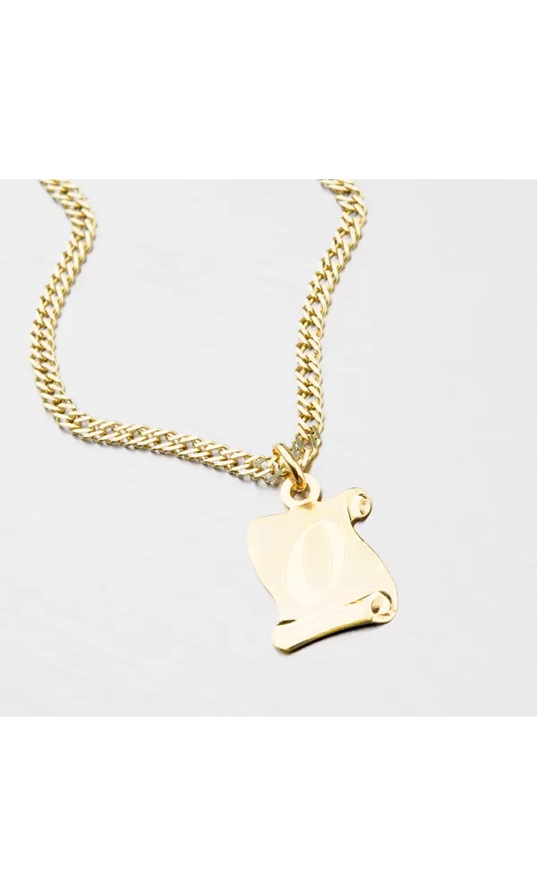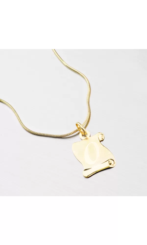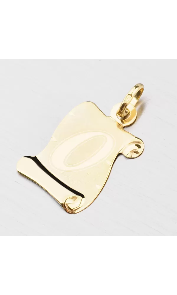 Krásny zlatý prívesok v tvare pergamenu, ktorý očarí svojou lesklou a matnou povrchovou úpravou. Prívesok je vyrobený zo žltého zlata s rýdzosťou 585/1000 a je možné ho ozdobiť vami vybranou rytinou na jeho zadnú stranu.