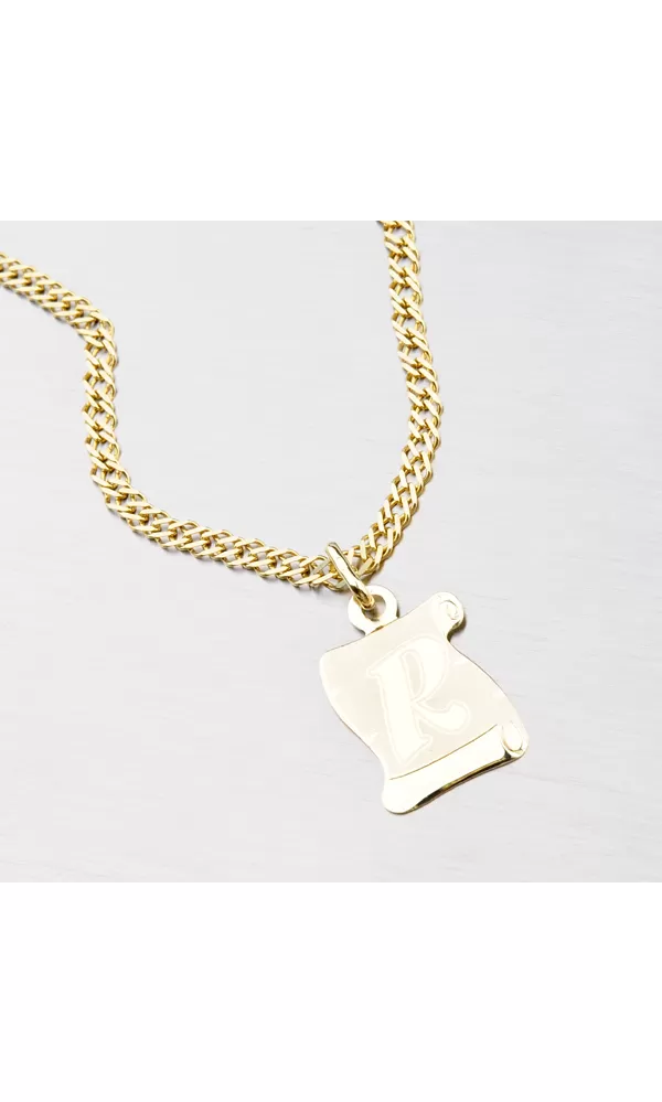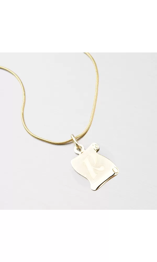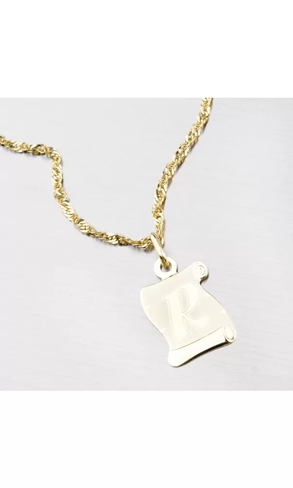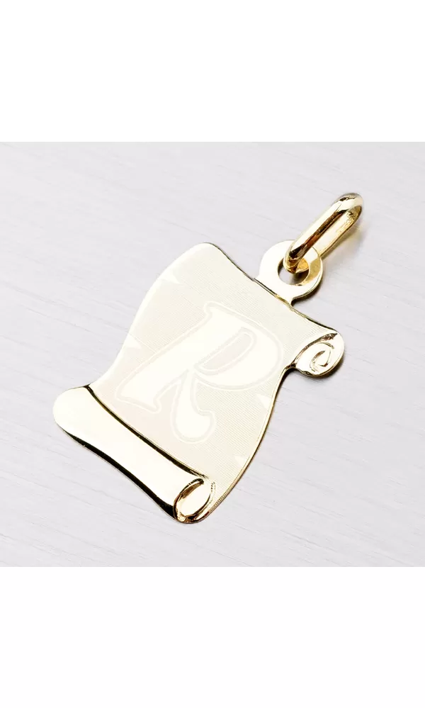 Krásny zlatý prívesok v tvare pergamenu, ktorý očarí svojou lesklou a matnou povrchovou úpravou. Prívesok je vyrobený zo žltého zlata s rýdzosťou 585/1000 a je možné ho ozdobiť vami vybranou rytinou na jeho zadnú stranu.