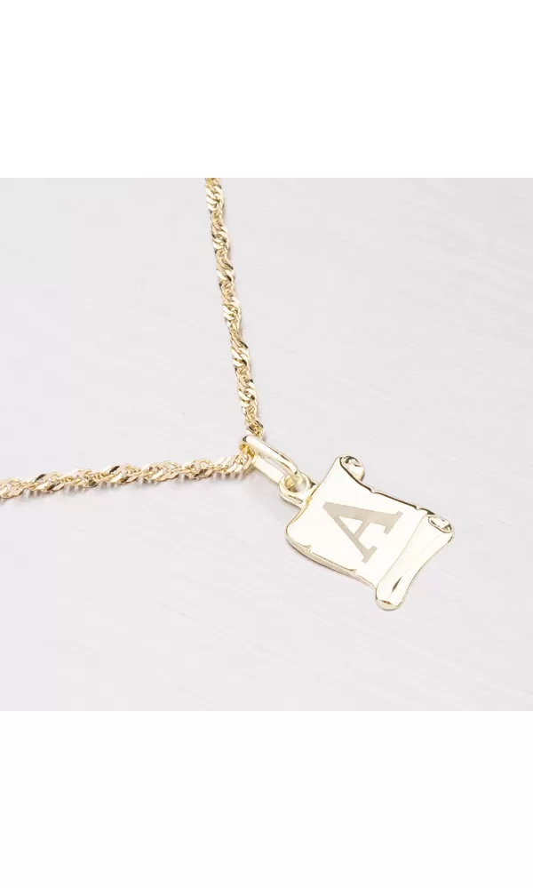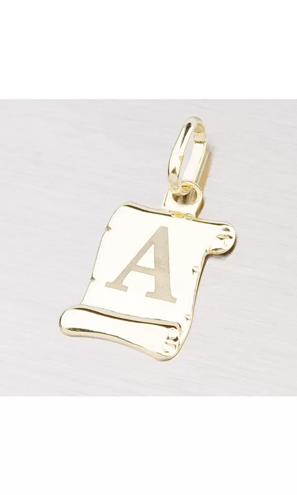 Prívesok v tvare pergamenu s matným písmenom A zo žltého štrnásťkarátového zlata - 585/1000 v lesklej povrchovej úprave.