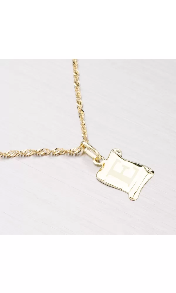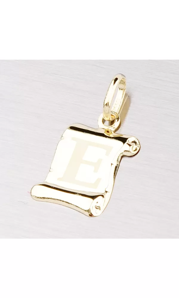 Prívesok v tvare pergamenu s matným písmenkom E zo žltého štrnásťtikarátového zlata - 585/1000 v lesklej povrchovej úprave.