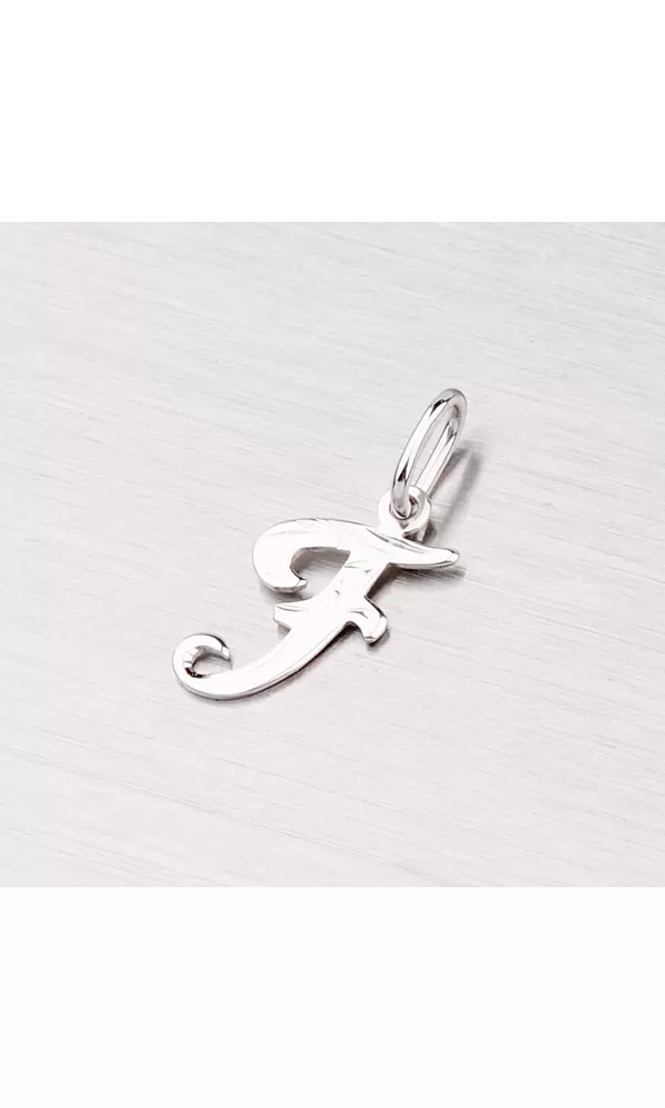 Jemný prívesok v tvare písmenka F z bieleho štrnásťkarátového zlata rýdzosti 585/1000 v lesklej povrchovej úprave. K prívesku je vhodné použiť retiazku s priemerom 1,50 mm.