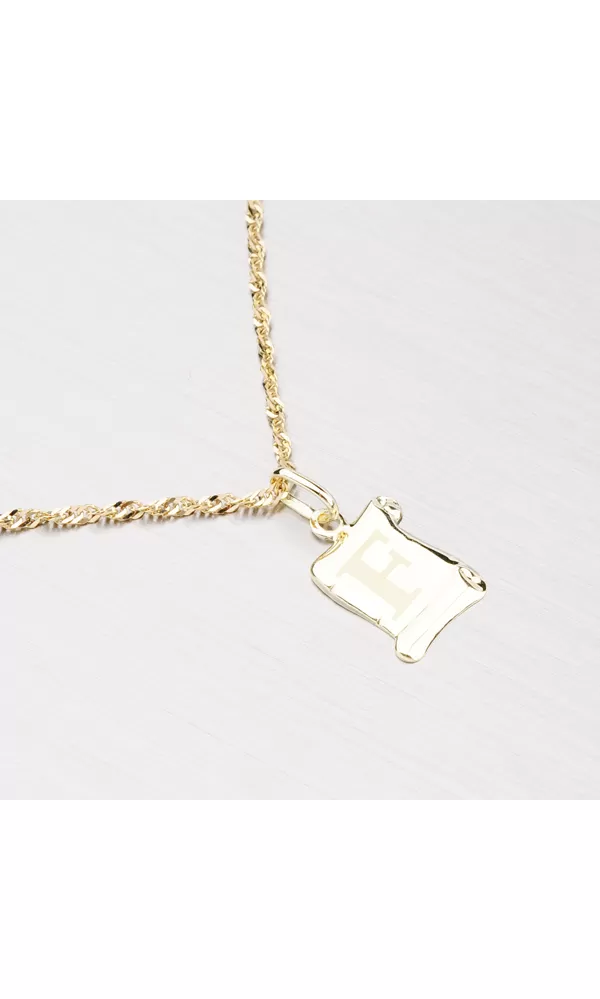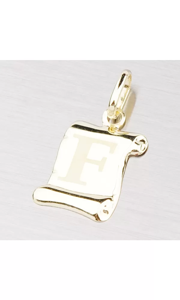 Prívesok v tvare pergamenu s matným písmenkom F zo žltého štrnásťtikarátového zlata - 585/1000 v lesklej povrchovej úprave.