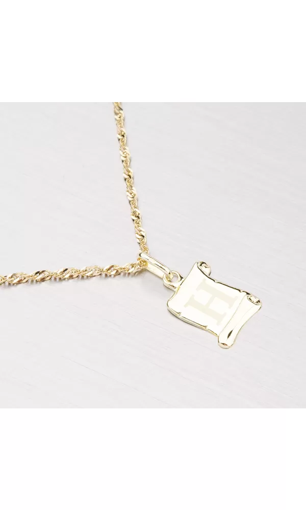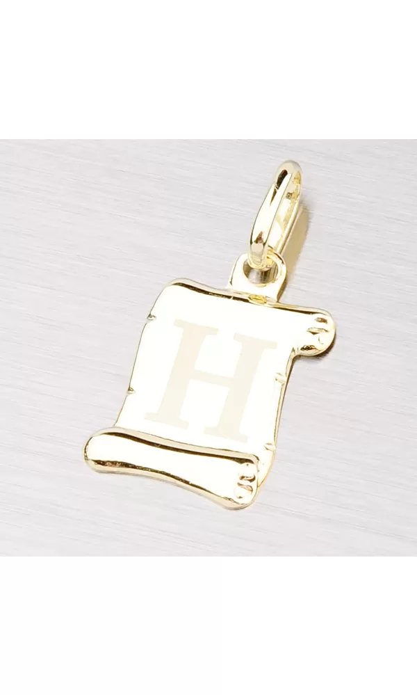 Prívesok v tvare pergamenu s matným písmenkom H zo žltého štrnásťtikarátového zlata - 585/1000 v lesklej povrchovej úprave.