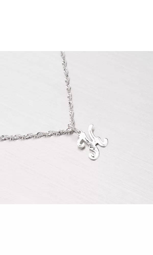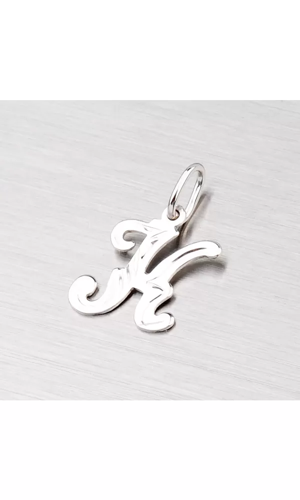 Jemný prívesok v tvare písmenka K z bieleho štrnásťkarátového zlata rýdzosti 585/1000 v lesklej povrchovej úprave. K prívesku je vhodné použiť retiazku s priemerom 1,50 mm.