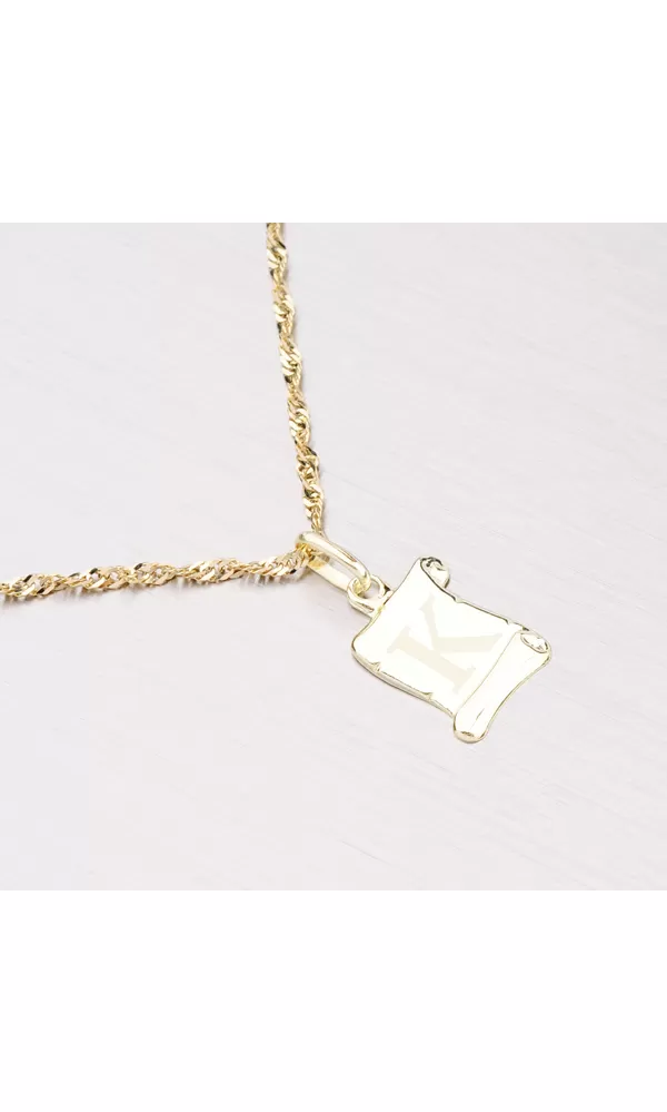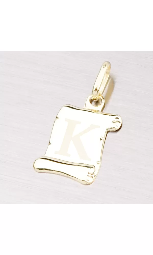 Prívesok v tvare pergamenu s matným písmenkom K zo žltého štrnásťtikarátového zlata - 585/1000 v lesklej povrchovej úprave.