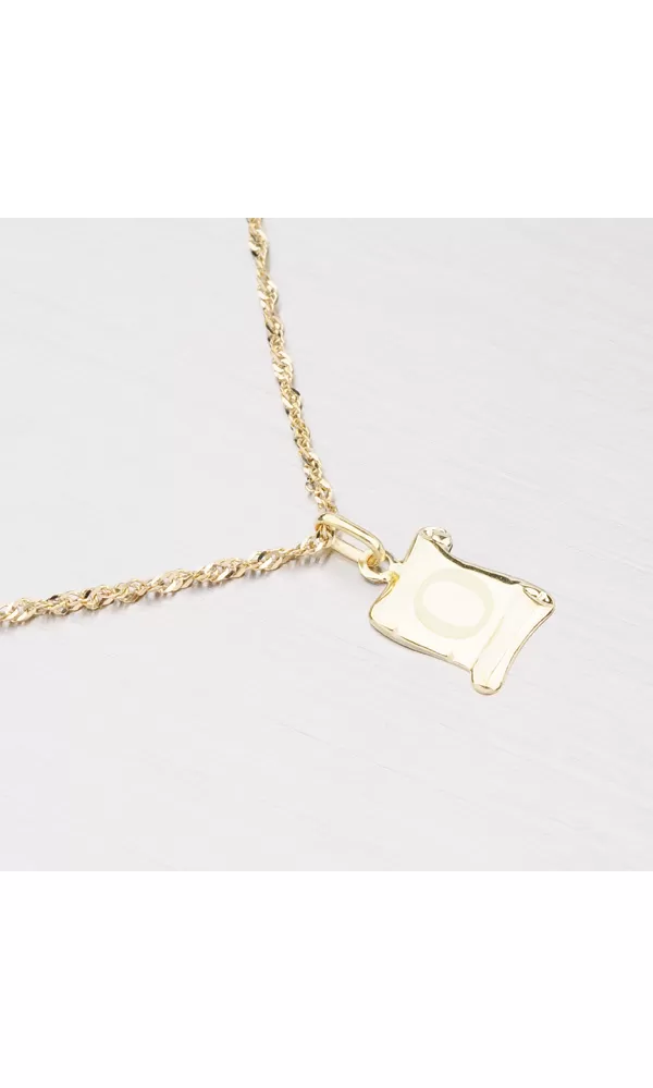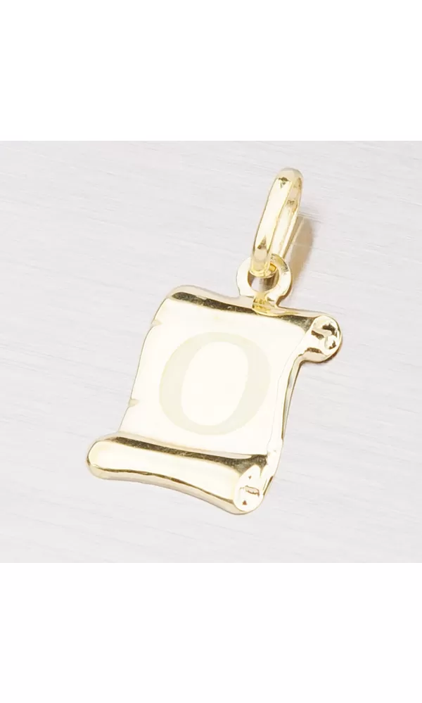 Prívesok v tvare pergamenu s matným písmenkom O zo žltého štrnásťkarátového zlata - 585/1000 v lesklej povrchovej úprave.