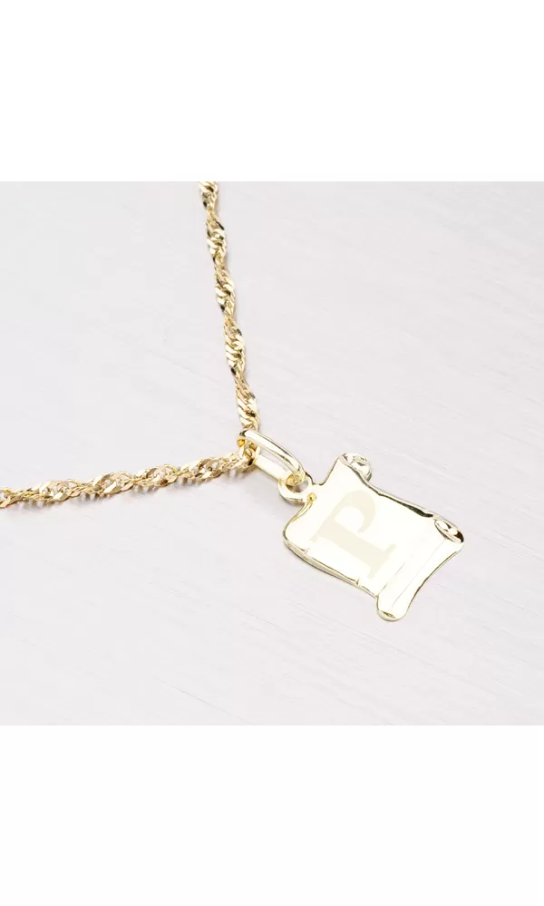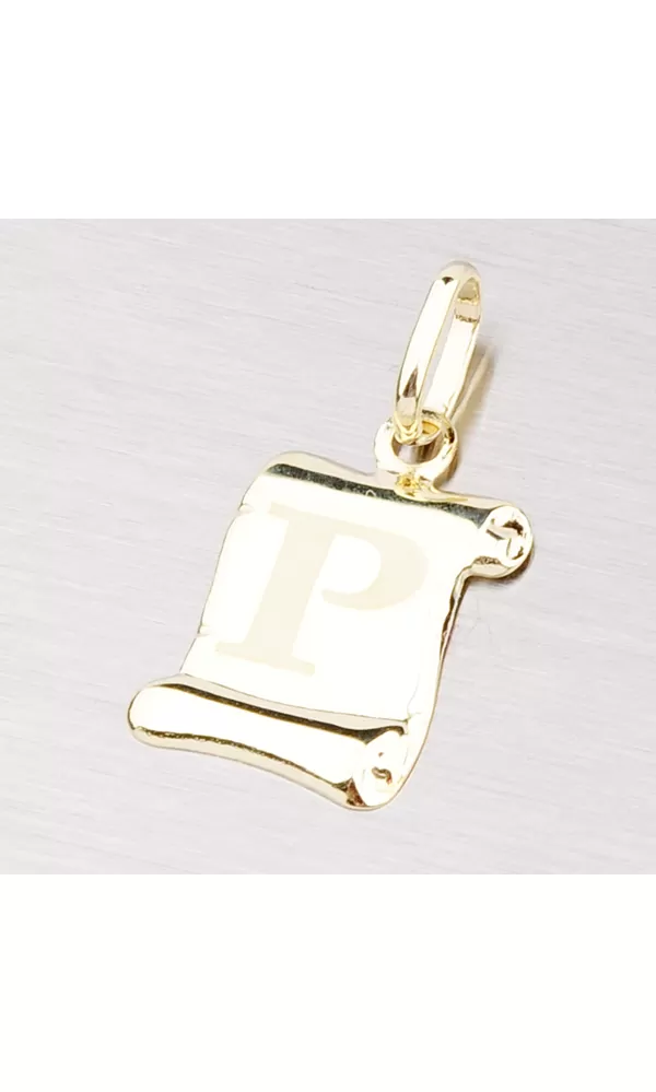 Prívesok v tvare pergamenu s matným písmenkom zo žltého štrnásťkarátového zlata - 585/1000 v lesklej povrchovej úprave.