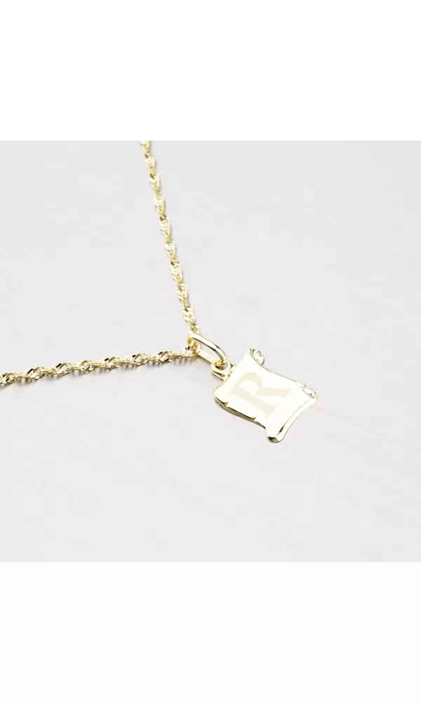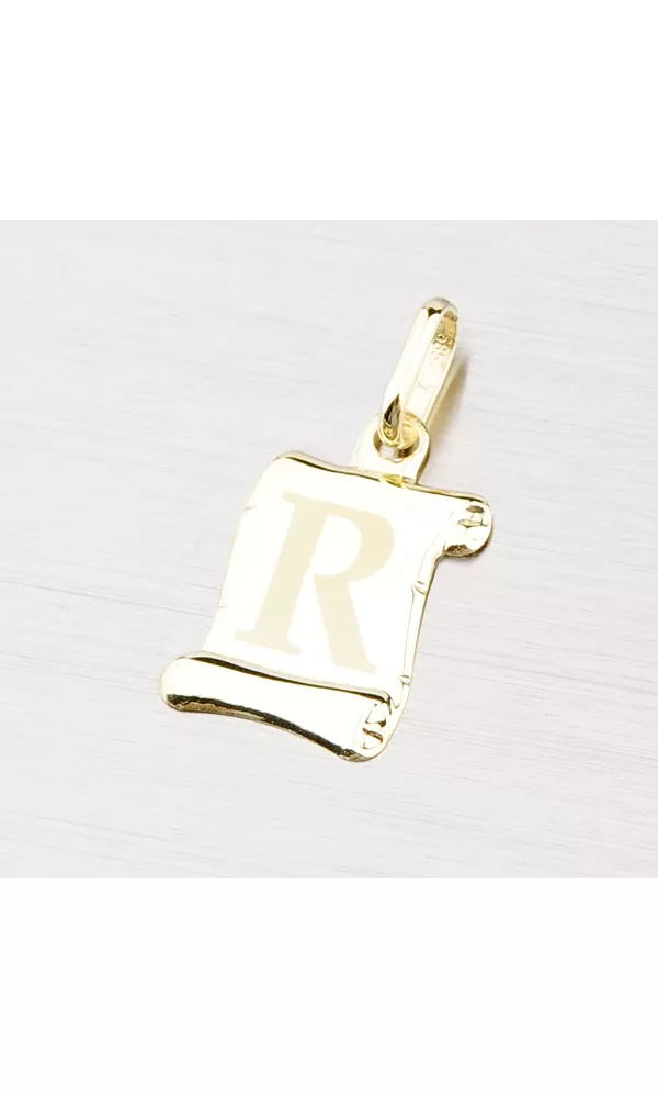Prívesok v tvare pergamenu s matným písmenkom Rze zo žltého štrnásťtikarátového zlata - 585/1000 v lesklej povrchovej úprave.