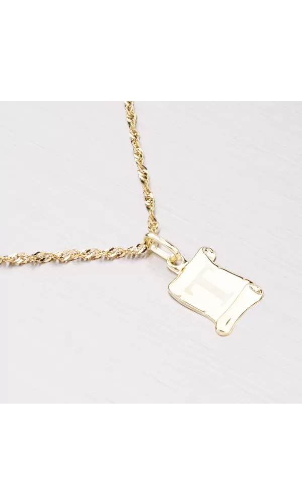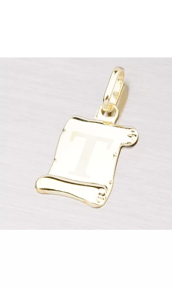 Prívesok v tvare pergamenu s matným písmenkom T zo žltého štrnásťkarátového zlata - 585/1000 v lesklej povrchovej úprave.