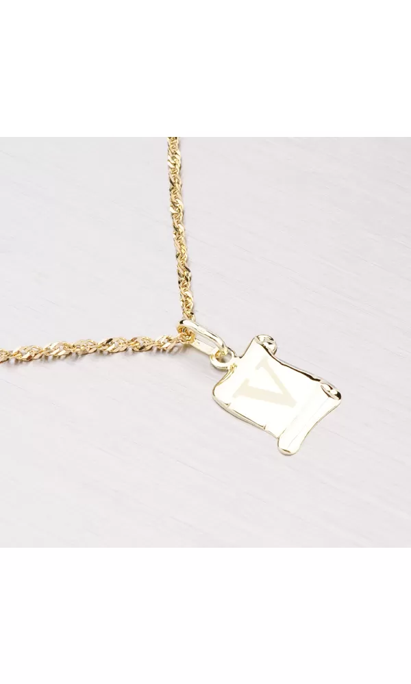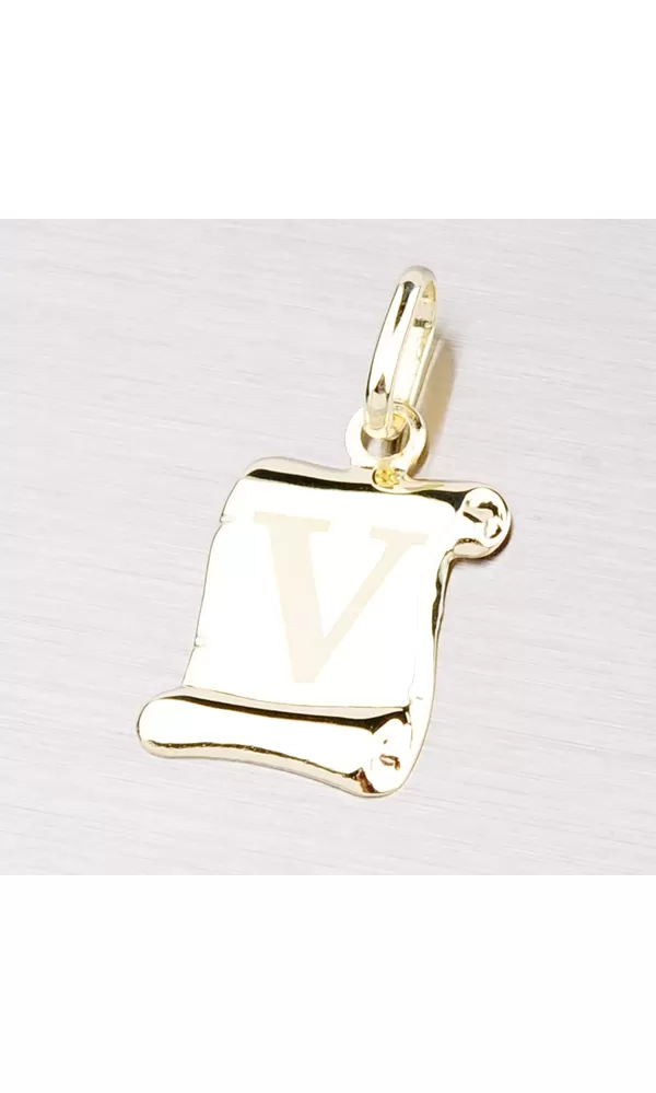 Prívesok v tvare pergamenu s matným písmenkom V zo žltého štrnásťtikarátového zlata - 585/1000 v lesklej povrchovej úprave.