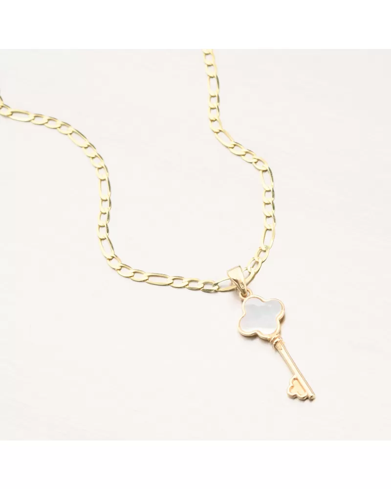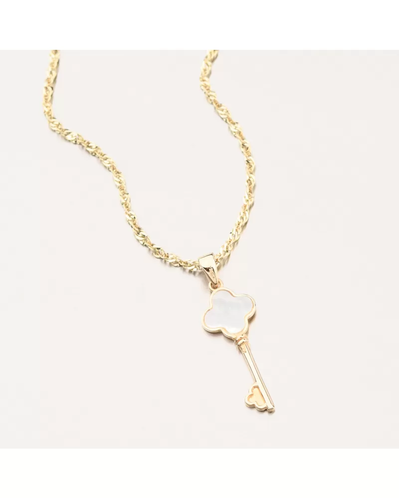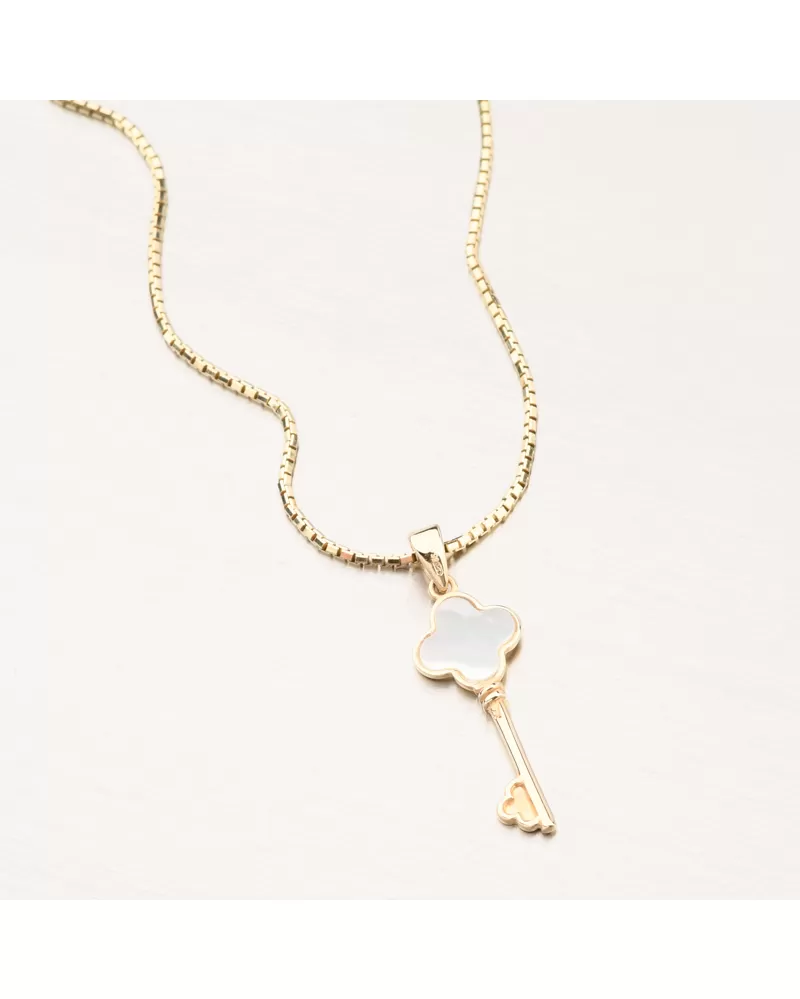 Prívesok je precízne vyrobený z kvalitného zlata a svojou nadčasovou eleganciou sa hodí ako na každodenné nosenie, tak aj ako štýlový doplnok na špeciálne príležitosti. Na retiazke pôsobí jemne, no zároveň je dostatočne pevná, aby podčiarkla individuálny štýl svojej nositeľky. Výnimočný šperk, ktorý v sebe spája symboliku kľúča a jemnú krásu perlete - ideálny ako darček alebo ako osobný talizman.