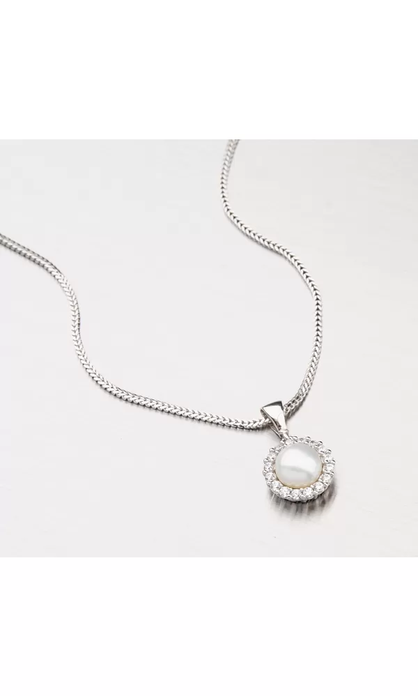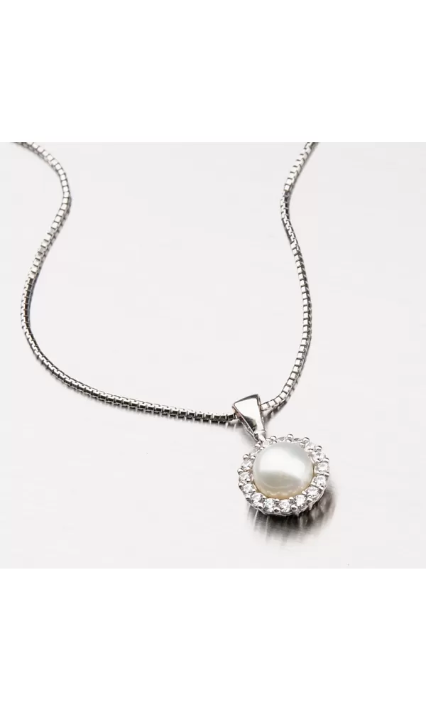 Romantický prívesok okrúhleho tvaru zdobí umelá perla bielej farby, ktorá je vysadená zirkónmi v briliantovom bruse. Krásny prívesok je vyrobený z bieleho zlata o rýdzosti 585/1000 v lesklej povrchovej úprave. K tomuto prívesku je vhodná retiazka so šírkou 1,50 mm.