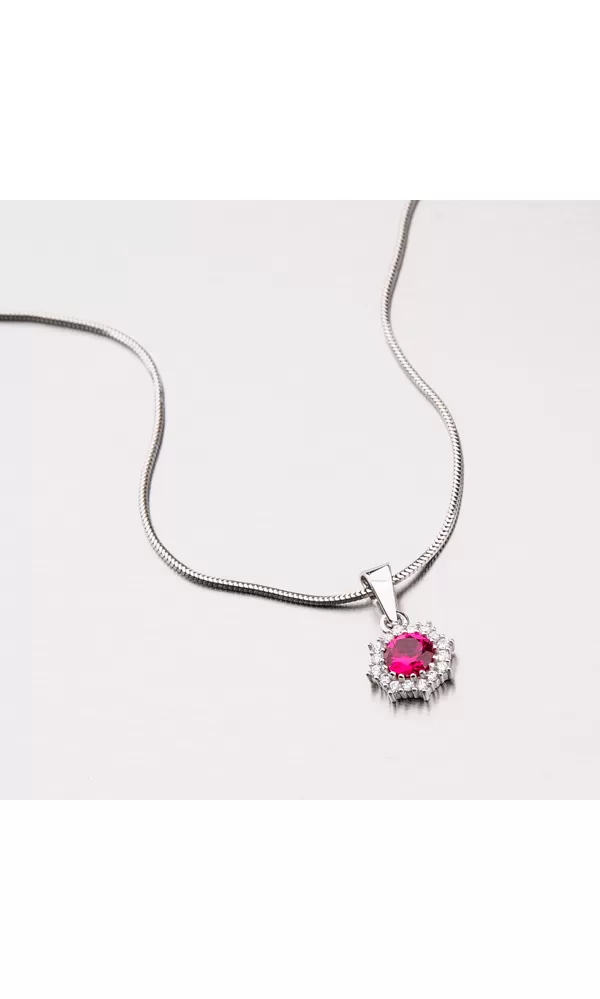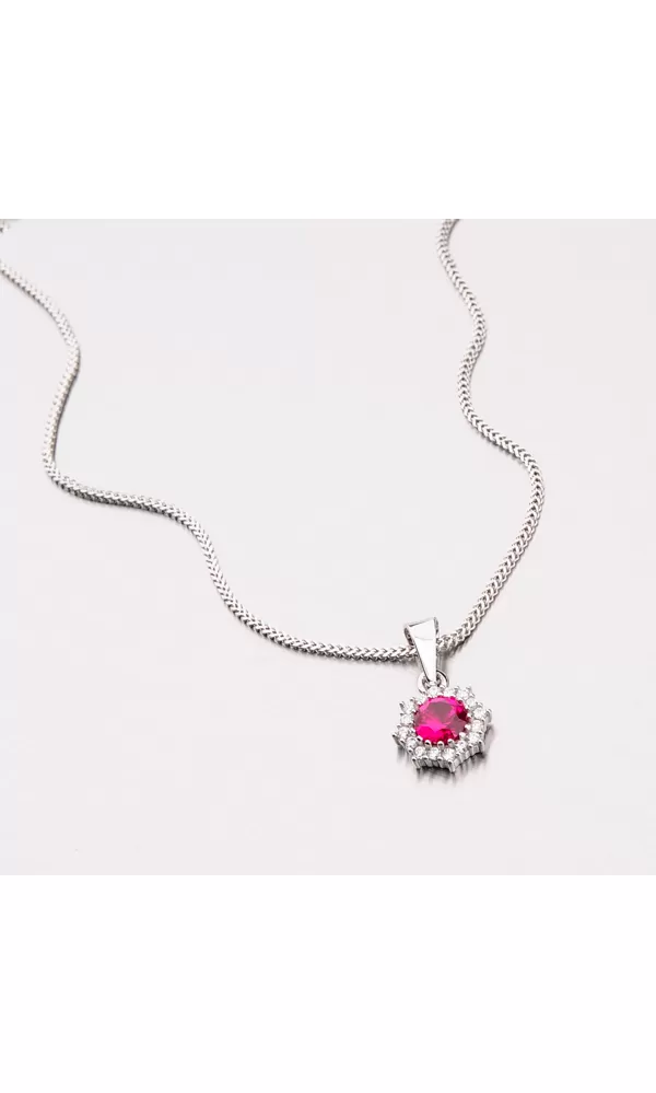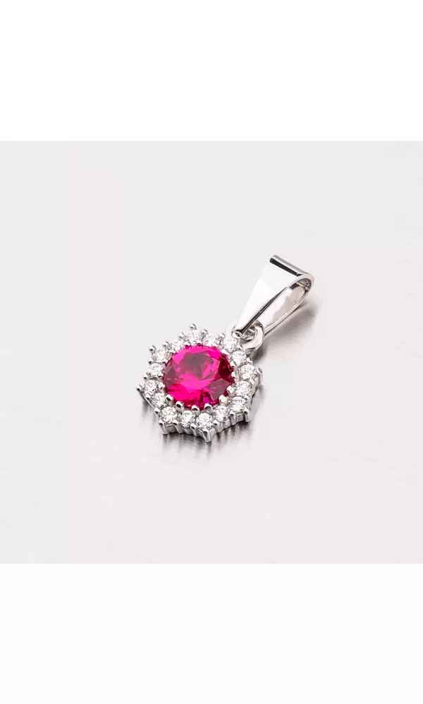 Jemný ale výrazný prívesok sa bude krásne vynímať e vašom dekolte. Prívesok je zdobený červeným zirkónom, ktorý je obklopený menšími čírymi zirkónmi… Celý popis