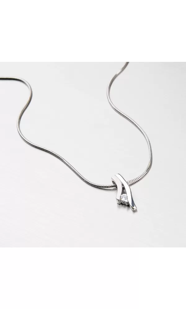 Prívesok s jedným bielym zirkónom z bieleho štrnásťkarátového zlata 585/1000 v kombinácii lesklej a matnej povrchovej úpravy. Na doplňujúcich… Celý popis