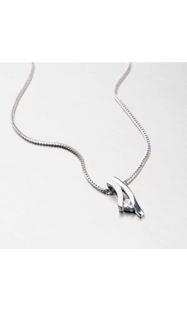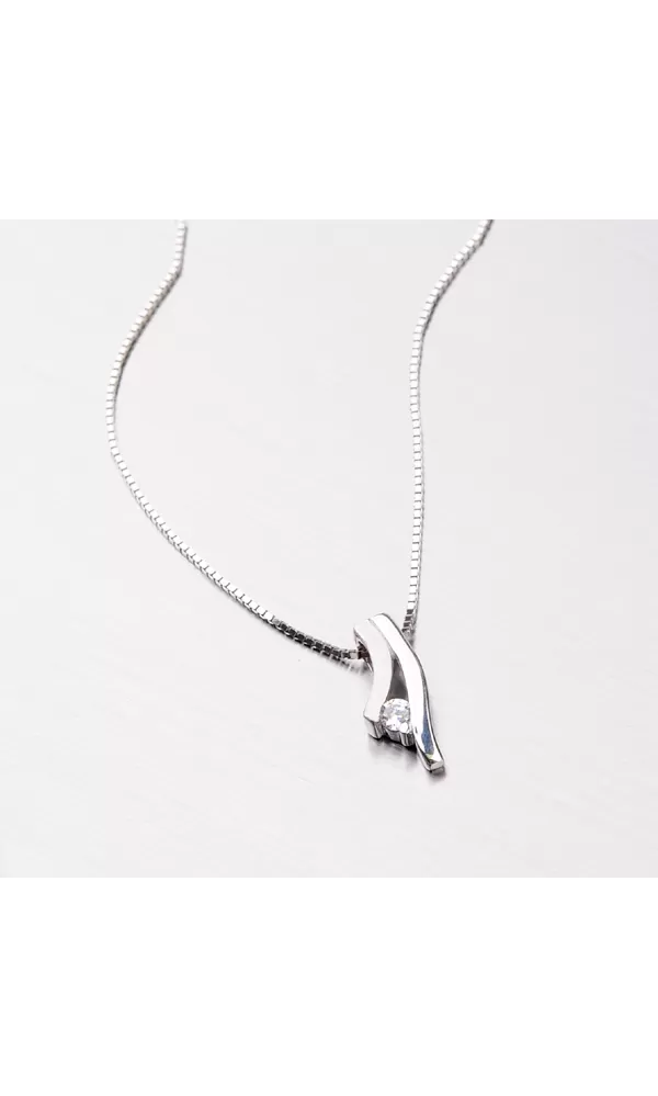 Prívesok s jedným bielym zirkónom z bieleho štrnásťkarátového zlata 585/1000 v kombinácii lesklej a matnej povrchovej úpravy.