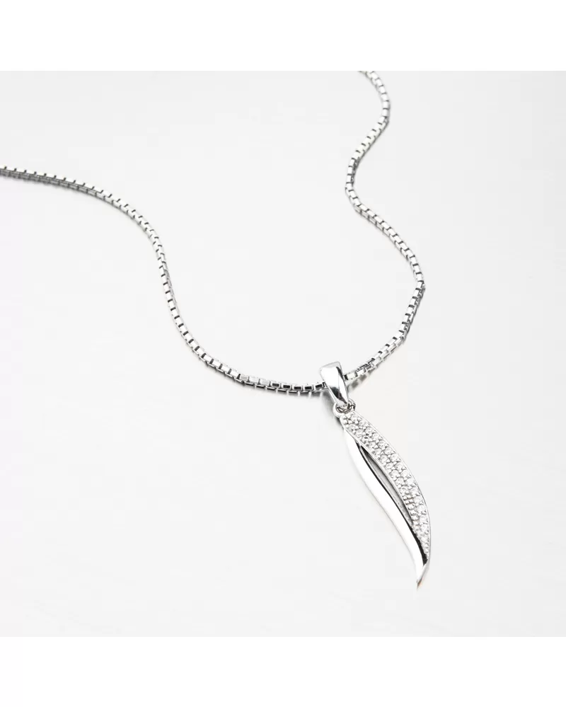 Skvelý tip na darček, ktorý zaručene oslní svojim elegantným designom. Prívesok je podlhovastého tvaru, kde jedna línia je vo vysokom lesku a druhá je osadená žiarivými zirkónmi v dvoch radoch. Zirkóny sú briliantového brusu, ktorý zaisťuje maximálnu brilanciu vybrúsených facet, dokonale odráža svetlo a neuveriteľne žiari z každého uhla pohľadu.