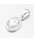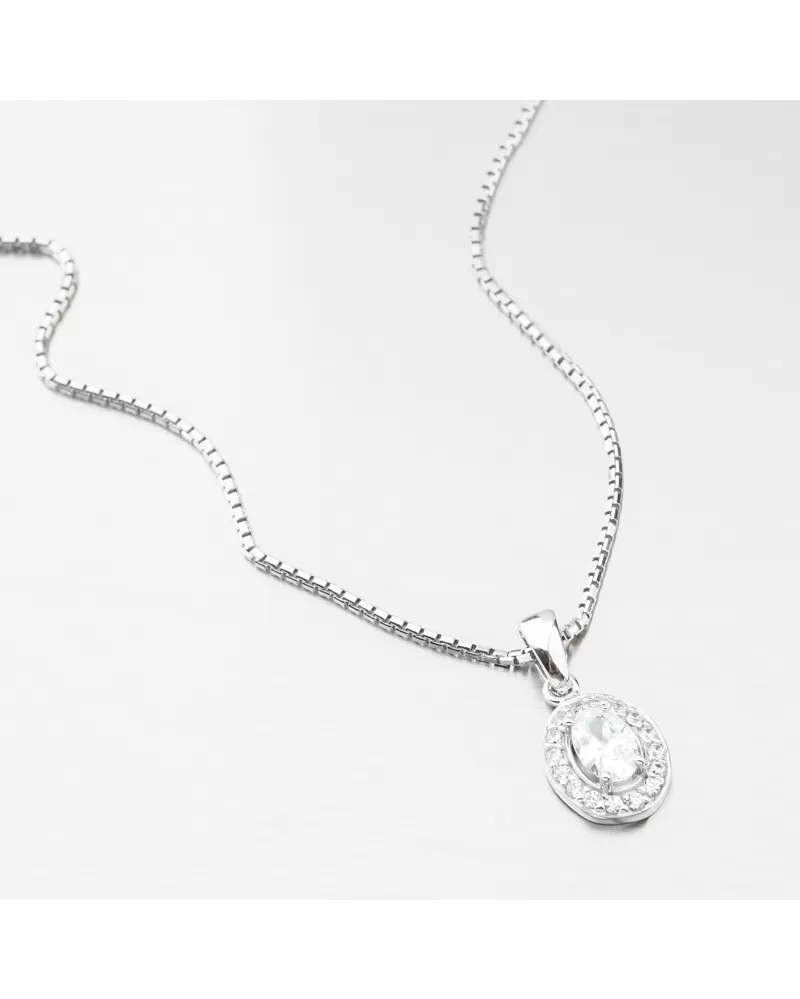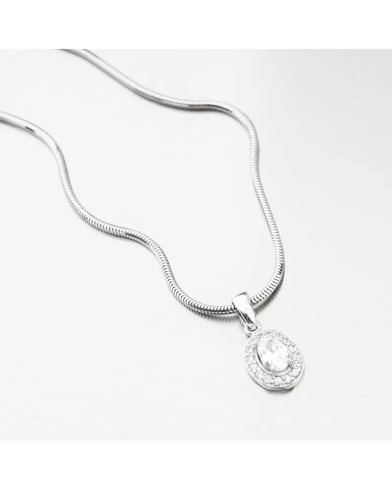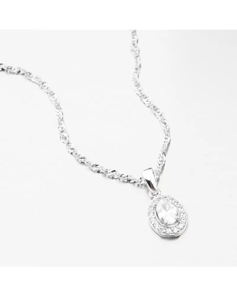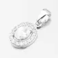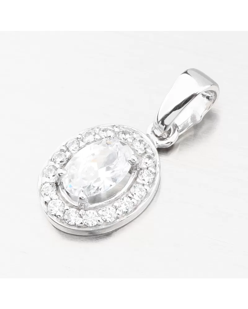 Nádherný přívěsek z bílého zlata s výrazným zirkonem oválného tvaru upevněný pomocí čtyř krapen. Okolo něj jsou vsazeny drobné zirkony briliantového brusu. Tento brus propůjčuje kamenům brilanci pravých diamantů. Tento přívěsek si zamilujete, dotáhne váš outfit k naprosté dokonalosti.