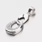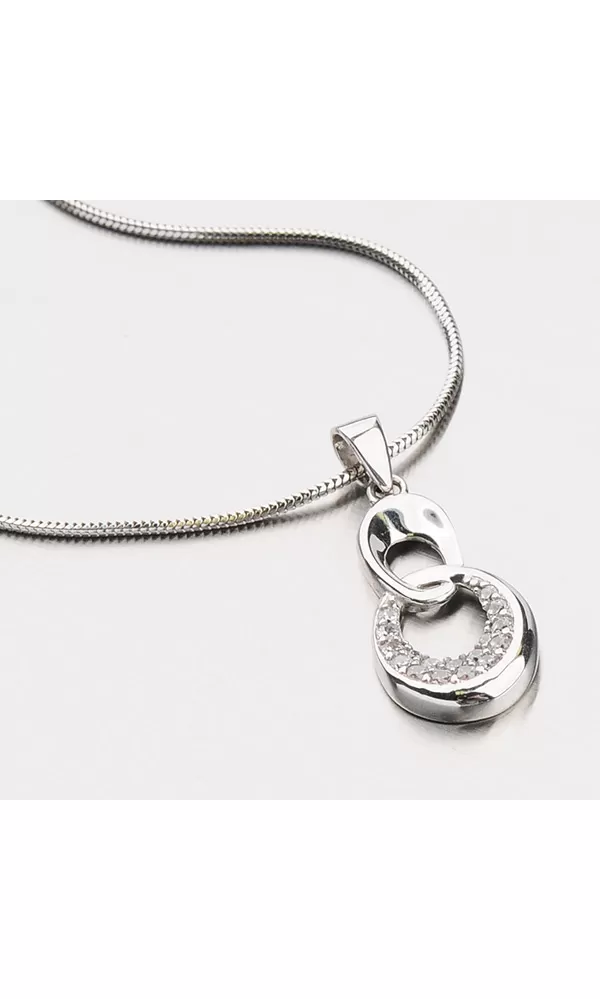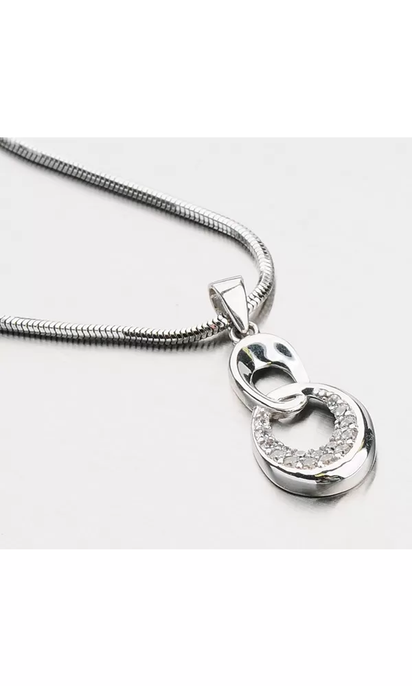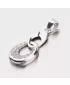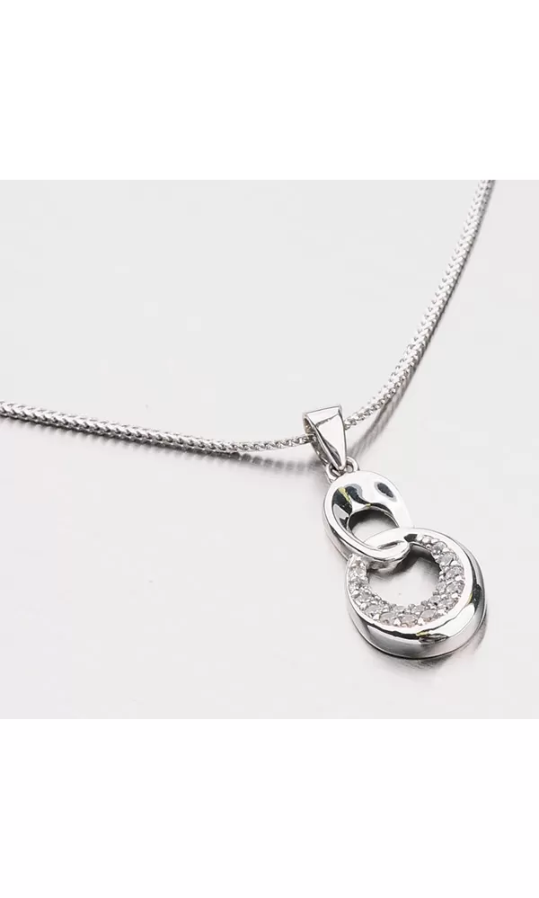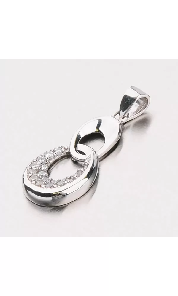 Prívesok vyrobený z bieleho zlata zložený z dvoch oválnych očiek s lesklým povrchom. Spodné očko je osadené žiarivými zirkónmi bielej farby, ktoré sú v briliantovom brúse.