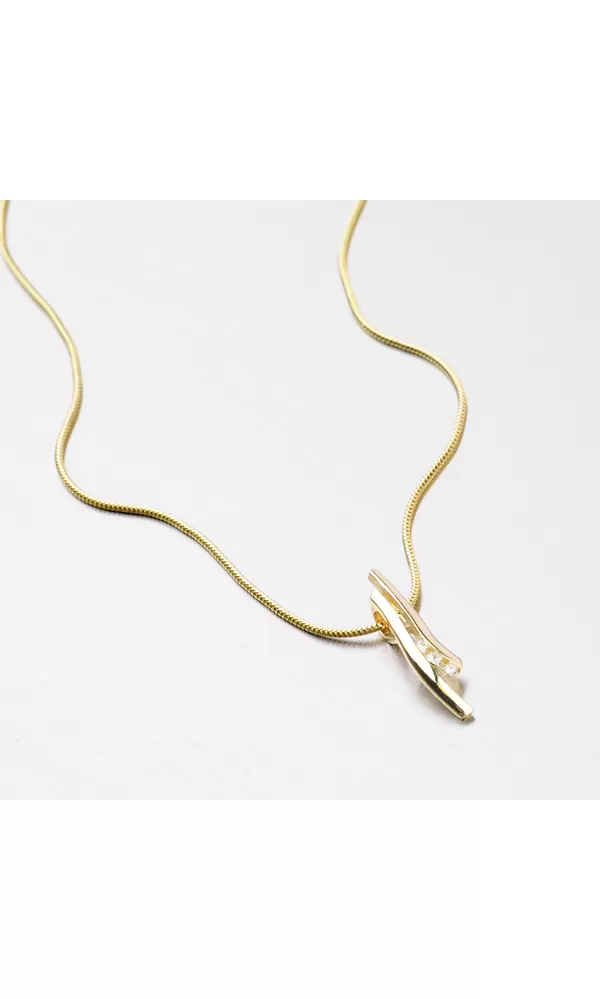 Prívesok s tromi bielymi zirkónmi zo žltého štrnástich karátového zlata 585/000 v lesklej povrchovej úprave. Prívesok je elegantným a moderným kúskom módy, ktorý nebudete chcieť zložiť.