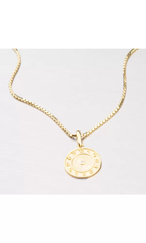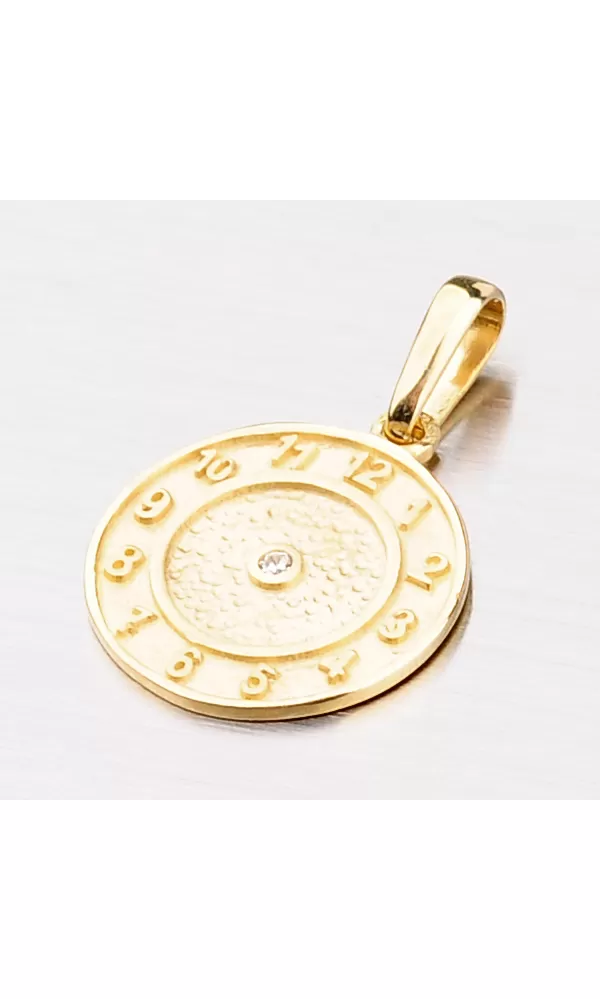 Krásny prívesok krstiacej hodiny zo žltého štrnásťkarátového zlata 585/1000 v lesklej povrchovej úprave. Stred ciferníka je zdobený zirkónom o… Celý popis