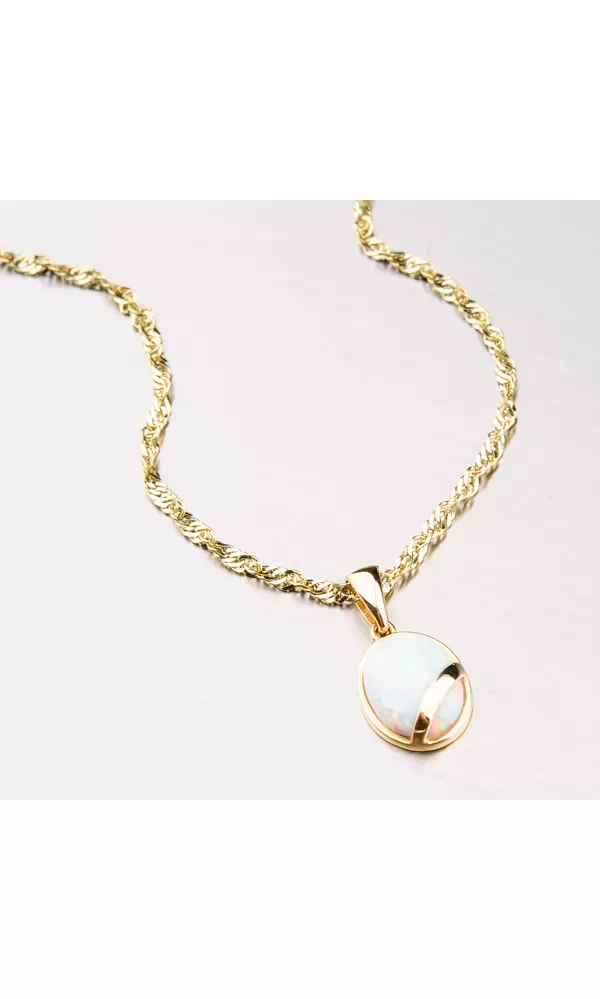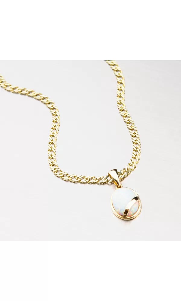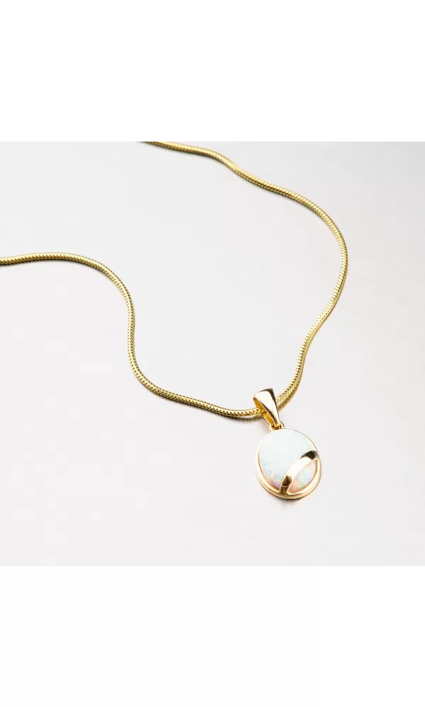 Opaly sú v súčasnosti zasiahnuté, takže tento prívesok nesmiete nechať ujsť, ktorý je zdobený opálom, ktorý oplýva klasickou krásou a hrá vo všetkých farbách presne tak, ako to môže opáli. Prívesok je vyrobený zo žltých štrnástich -karátových zlatých 585/1000 v lesklom povrchu.