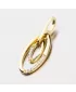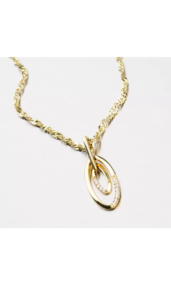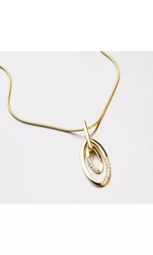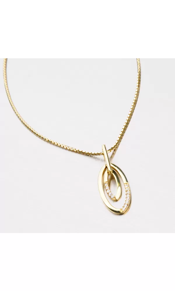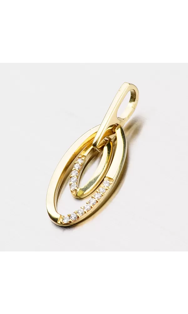 Moderný prívesok v tvare dvoch do seba vsadených oválkov zo žltého štrnástich karátového zlata 585/000 v lesklej povrchovej úprave s bielymi zirkónmi.