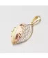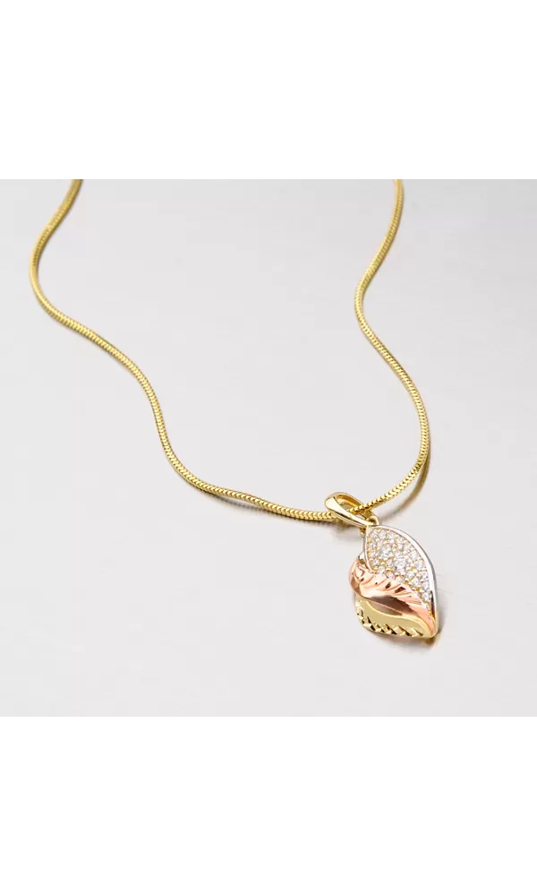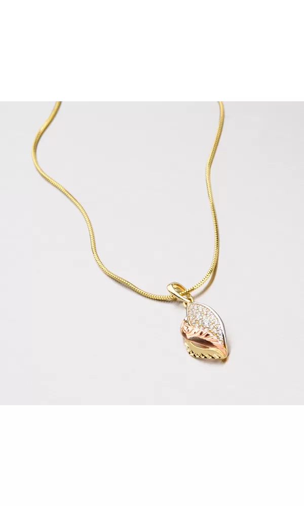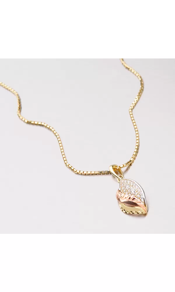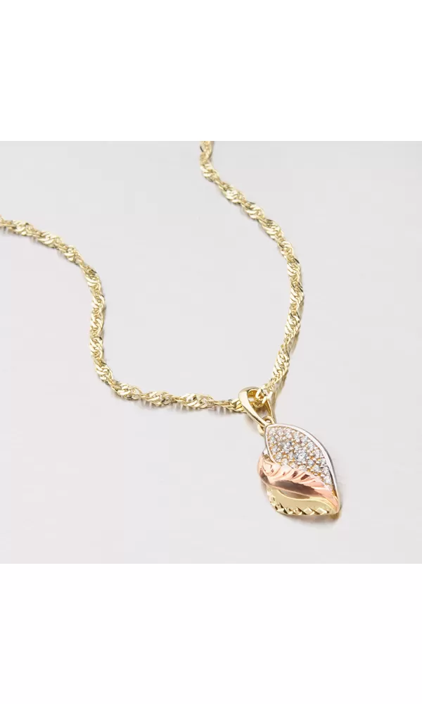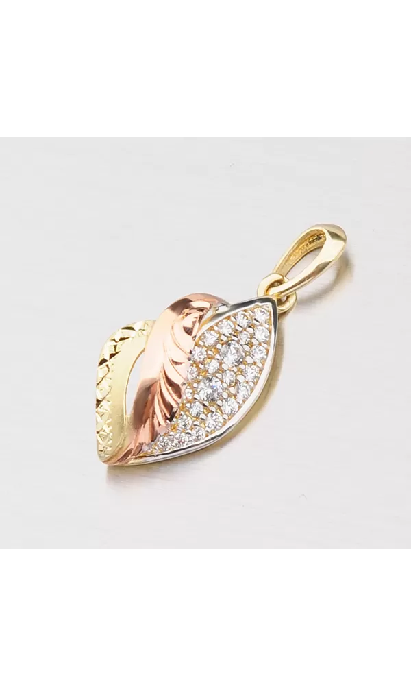 Tento zlatý prívesok zaručene poteší Vašich milovaných! Prívesok je vyrobený z bieleho, žltého a červeného štrnásťkarátového zlata 585/1000 v lesklej a matnej povrchovej úprave. Prívesok má pravý lístok osadený bielymi zirkónmi, prostredný a krajný výlisok je zdobený ručnou rytinou. K dokonalosti prívesku chýba už len retiazka napr. 304-0003, ktorú je vidieť na doplňujúcej fotografii alebo je vhodné použiť retiazku s maximálnym priemerom 2,50 mm.