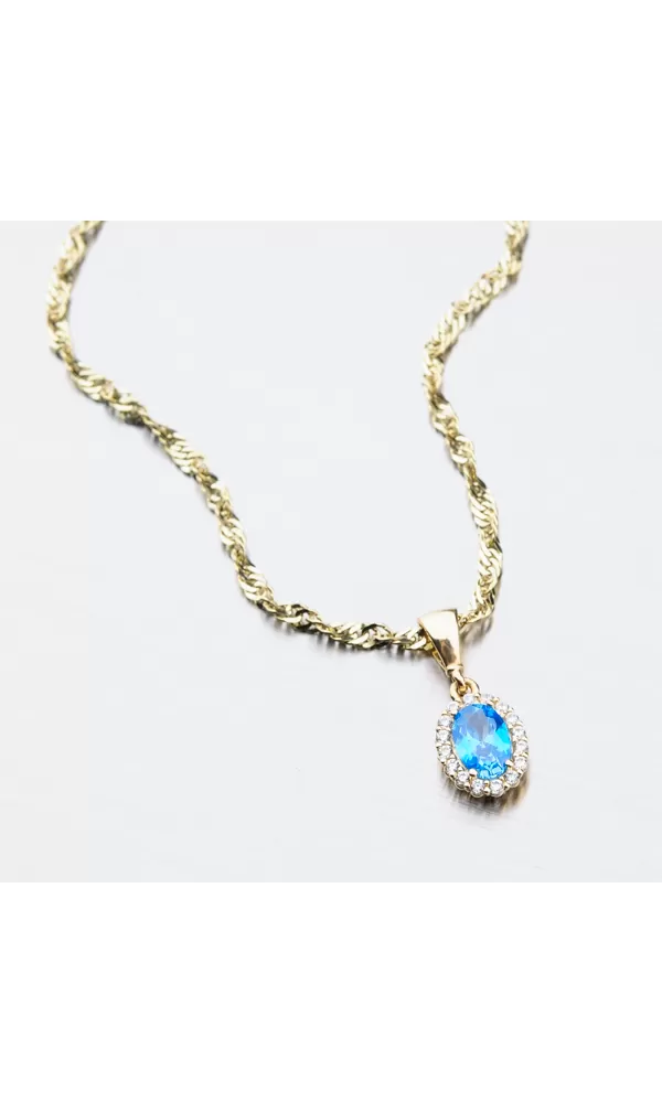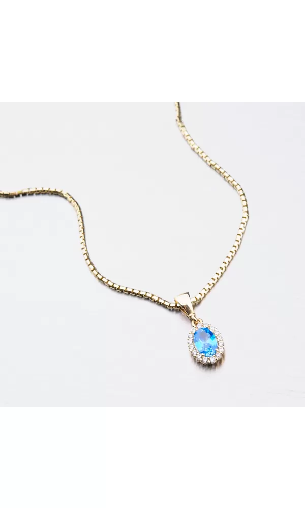 Zdôraznite svoj dekolt týmto príveskom. Tomuto prívesku dominuje veľký syntetický akvamarín brúsený do oválneho brúsu. Okolo oválneho syntetického akvamarínu sú vsadené menšie zirkóny nemenej tak žiarivo. Sú brúsené do briliantového brusu. Prívesok je navrhnutý tak, aby dokonale priľnul k dekoltu a neotáčal sa. Jeho ligot sa bude násobiť každým vašim pohybom.