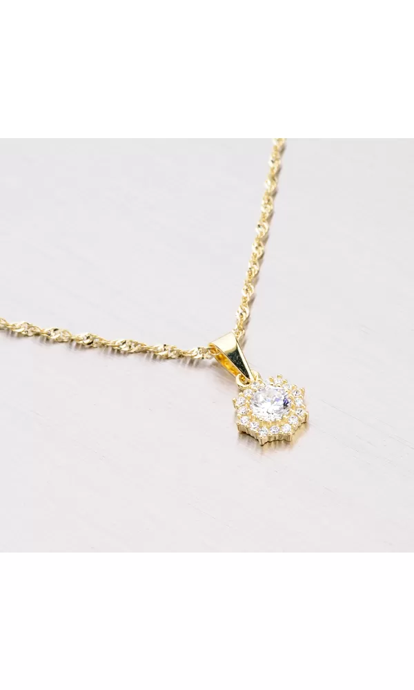 Tento nádherný prívesok je vyrobený zo žltého štrnásťkarátového zlata 585/1000 v lesklej povrchovej úprave. Prívesok je zdobený jedným väčším bielym zirkónom uprostred a niekoľkými drobnými bielymi zirkónmi okolo. S týmto príveskom zaručene oslníte.